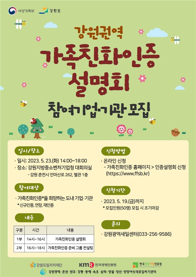[강원사회복지신문 서은진 기자]=개정된 심사지표 설명 및 그룹 컨설팅 진행 강원도와 강원도일자리재단(대표이사 박광용)이 운영하는 강원광역새일센터는 오는 5월 23일 강원지방중소벤처기업청 대회의실에서 가족친화인증 설명회를 개최한다. 한국경영인증원, 한국건강가정진흥원과 함께 진행하는 이번 설명회에서는 가족친...