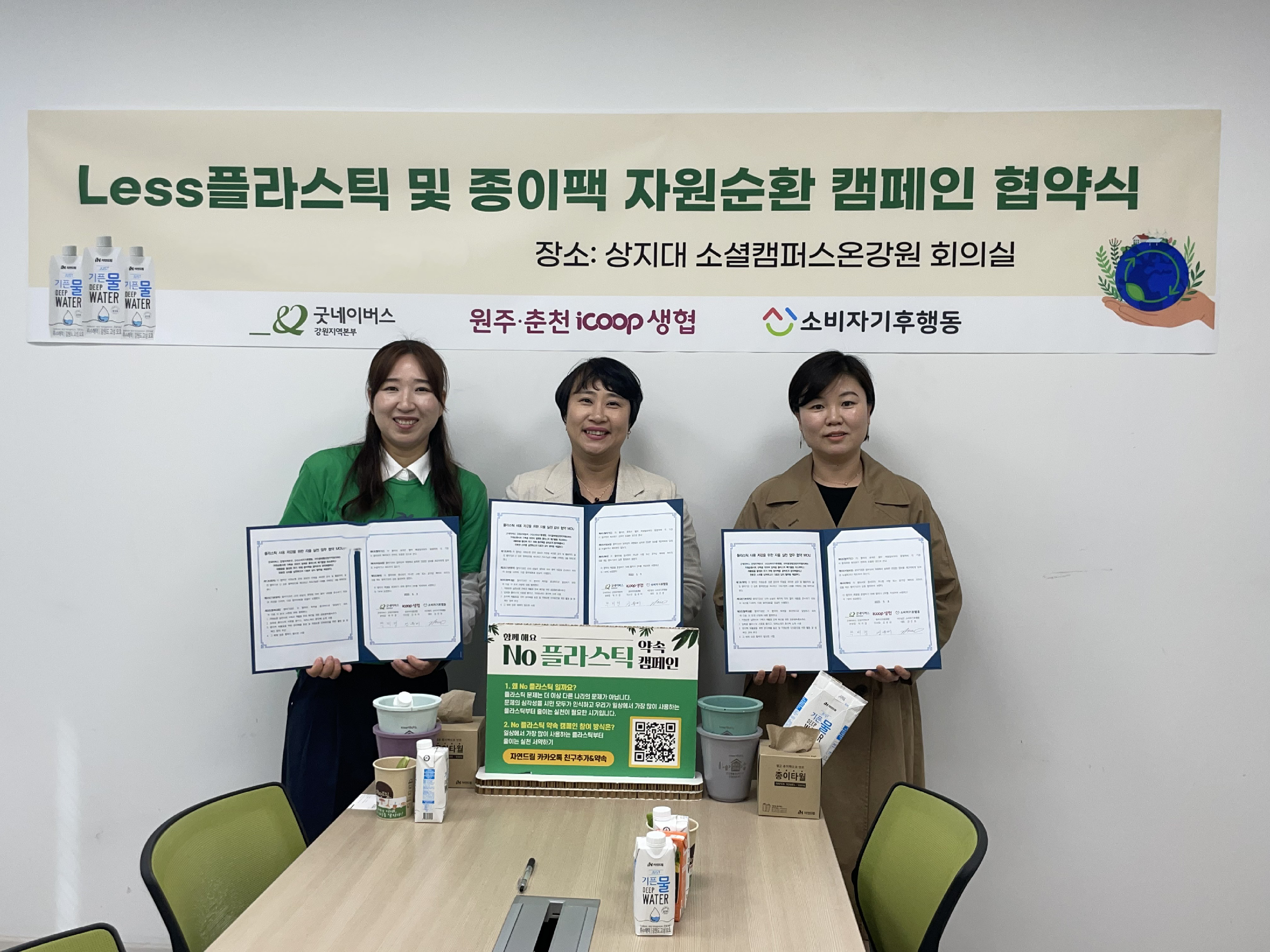 [강원사회복지신문 서은진 기자]=굿네이버스 강원지역본부(본부장 박미경)는 지난 5월 4일 소비자기후행동(대표 김은정)과 아이쿱생협 강원지역협의회(원주해맑은미소아이쿱생협 이사장 김유미, 춘천아이쿱생협 이사장 안승혜)와 강원지역의 자원순환사회 구축을 위한 업무협약식을 진행했다. 협약식은 원주 상지대학교에서 ...