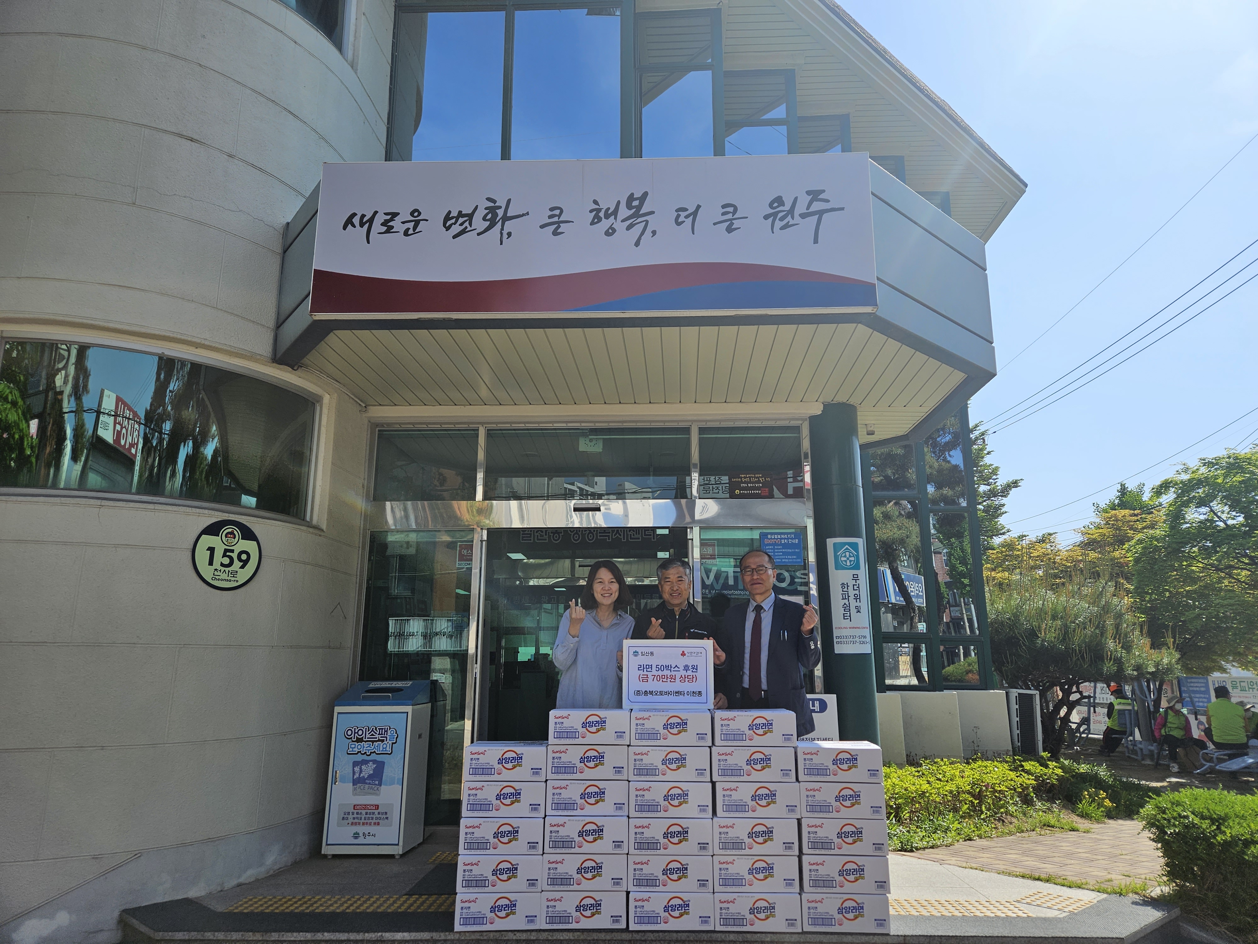 [강원사회복지신문 홍기한 기자]=충북오토바이쎈타(대표 이현종)는 지난 5월 3일 원주시 일산동 행정복지센터에관내 저소득가구를 위한 라면 50박스를 전달했다. 후원물품은 일산동 행정복지센터를 통해 관내 저소득 취약계층 50가구에 전달될 예정이다.