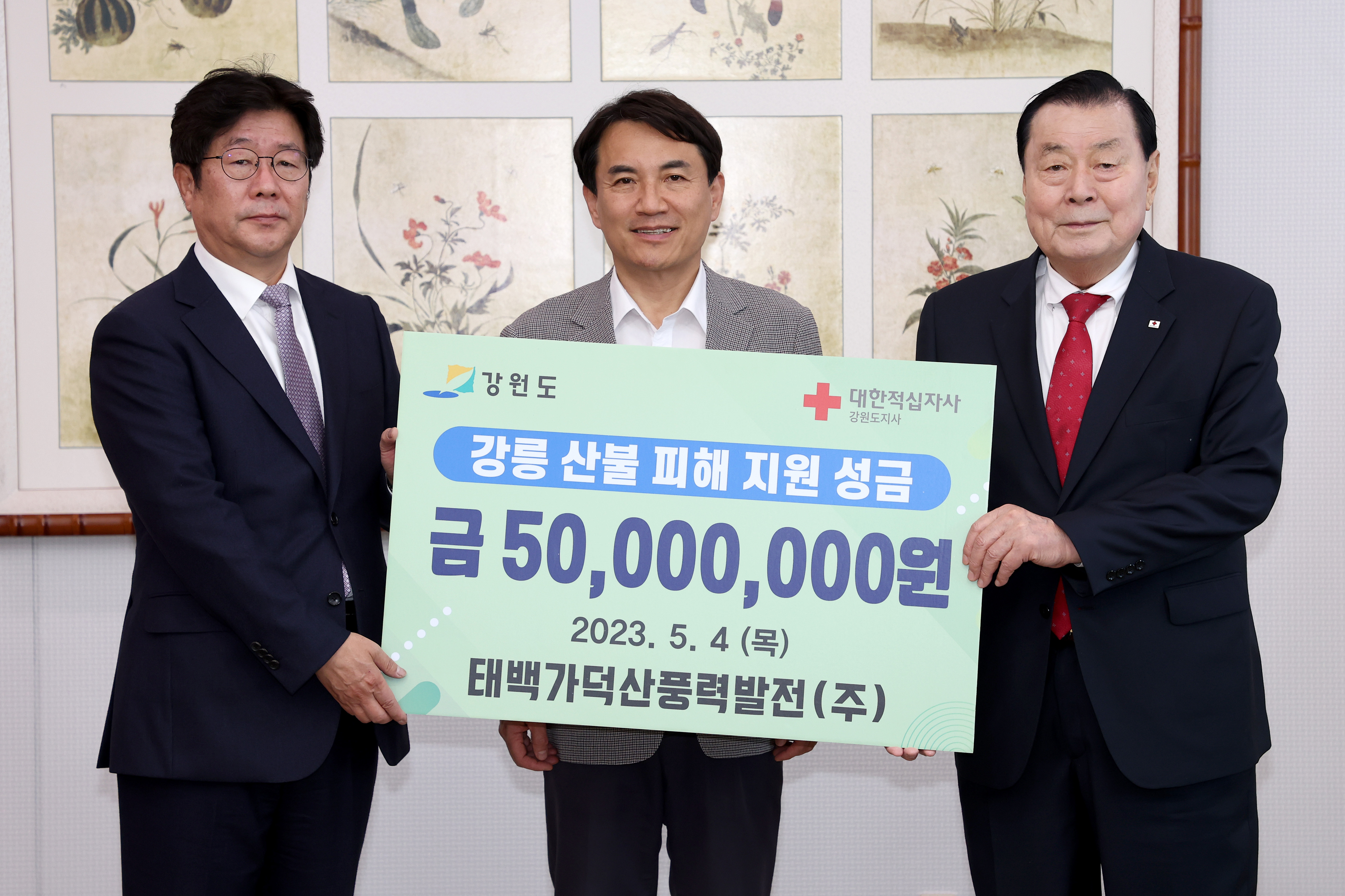 [강원사회복지신문 이정환 기자]=태백가덕산풍력발전(주) 권오철 대표이사는 강릉에서 발생한 산불 피해 구호를 위한 성금 5천만원을 지난 5월 4일 강원도지사에게 전달하였다. 이날 성금 전달에는 태백가덕산풍력발전(주)의 주주사인 한국동서발전 오태환 처장과 태백시 김대승 이사가 참석하였으며, 기부처인 대한 적십자사...