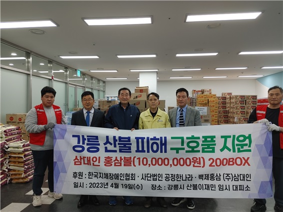 [강원사회복지신문 홍기한 기자]=(사)공정한나라 부회장 김세욱, 사무총장 강택구, 한국지체장애인협회 강릉 박용근지회장과 강릉시 김종욱부시장 등은 지난 4월 19일 화요일 오후2시 강릉산불피해를 입은 이재민들의 슬픔을 위로하고자 삼대인 홍삼볼 10.000.000 원(200박스) 상당의 음료를 강릉아레나 이재민 임시대피소에...