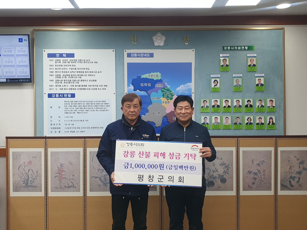 [강원사회복지신문 이정환 기자]=평창군의회(의장 심현정)는 지난 4월 18일 강릉시의회를 방문하여 강릉시 일대에 발생한 산불 피해 성금 100만원을 전달했다. 심현정 의장은 "강릉시는 평창군과 함께해온 친구이자 이웃이며 이번 성금이 산불로 아픔을 겪고 계실 주민분들에게 조금이나마 위로가 되길 바란다."라고 말했다....