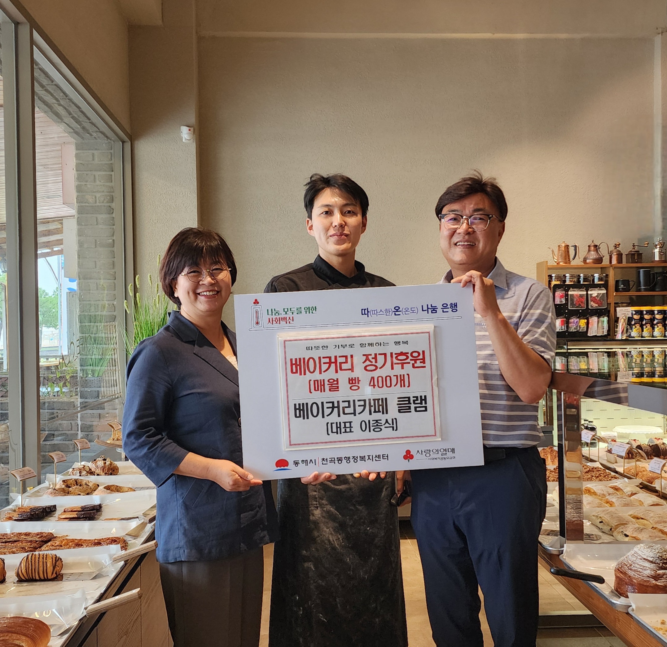 베이커리카페 클램 2020년부터 4년째 지역 내 취약계층에게 베이커리 후원 동해시에 소재한 베이커리카페 클램이 천곡동 취약계층을 위해 매달 400여 개의 베이커리를 후원하며 지역사회에 훈훈한 미담을 전하고 있다. 베이커리카페 클램은 2020년부터 4년째 매주 정기적으로 지역 내 취약계층에게 신선하고 다양한 종류의 베...