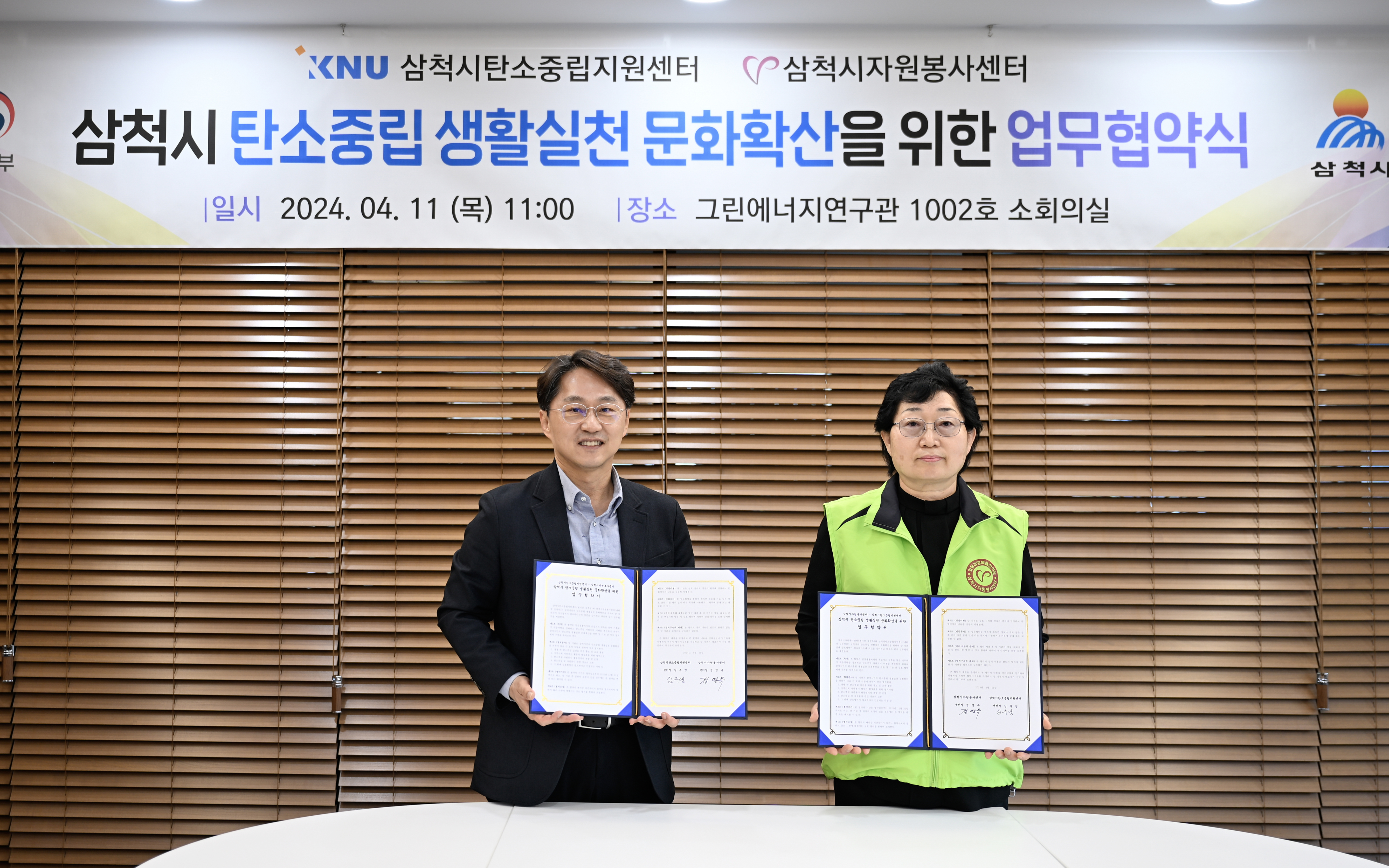 삼척시탄소중립지원센터(센터장 : 김주영)와 삼척시자원봉사센터(센터장 : 정영옥)는 지난 4월 11일 강원대학교 삼척캠퍼스 그린에너지연구관 소회의실에서 ‘삼척시 탄소중립 생활실천 문화확산을 위한 업무협약’을 체결했다. 양 기관의 이번 업무협약은 삼척시민의 탄소중립 생활실천 문화확산을 위하여 기관 간 상호협력...