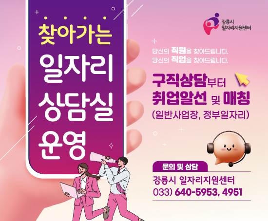 일자리 원스톱서비스로 2024년 820명 채용지원 강릉시청 1층 종합민원실 내 위치하고 있는 ‘강릉시 일자리지원센터’에서는 취업난과 구인난을 해소하기 위해 ‘일자리발굴단’과‘일자리상담실’을 상시 운영한다. ‘일자리발굴단’은 해당 기업이 원하는 구인사항(채용조건)을 사전 파악하고 전문직업상담사가 기업의 근무...