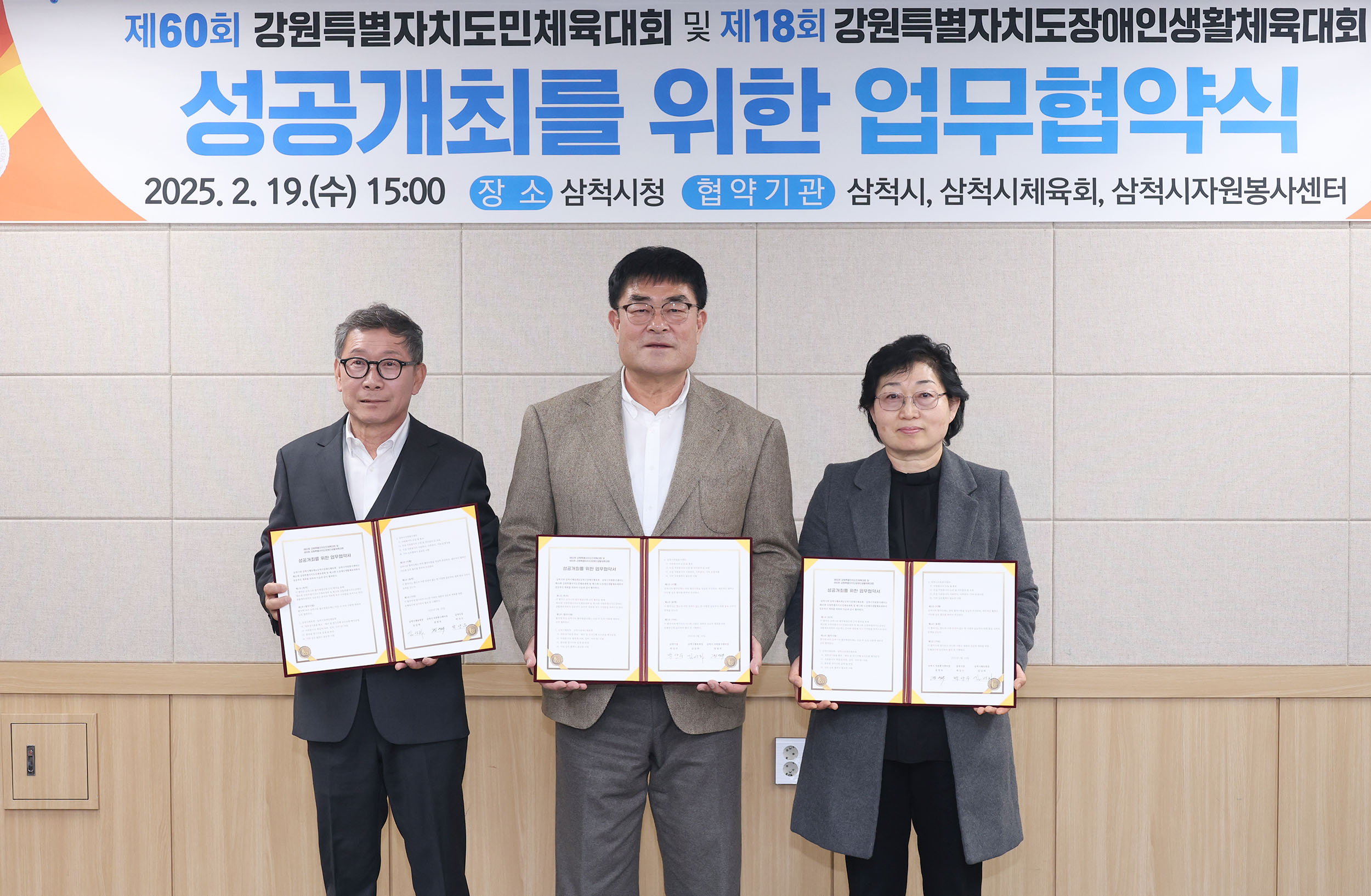 삼척시가 2월 19일 삼척시체육회, 삼척시자원봉사센터와 제60회 강원특별자치도민체육대회 및 제18회 강원특별자치도장애인생활체육대회의 성공개최를 위한 업무협약을 체결했다. 박상수 삼척시장, 김상하 삼척시체육회장, 정영옥 삼척시자원봉사센터장이 참석한 가운데 삼척시청에서 열린 이번 업무협약식에서는 원활한 대회...