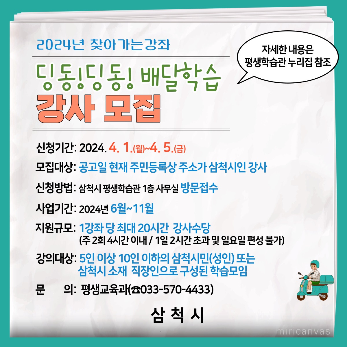 삼척시는 4월 1일(월)부터 5일(금)까지 ‘2024년 찾아가는 강좌 딩동! 딩동! 배달학습’ 강사를 모집한다고 밝혔다. 찾아가는 강좌 ‘딩동!딩동! 배달학습’은 지역 유휴 학습공간을 이용하여 학습자가 원하는 시간과 장소에 전문자격을 갖춘 강사를 파견·학습강좌를 배달하는 차별화된 평생학습 맞춤형 프로그램이다. 2024...