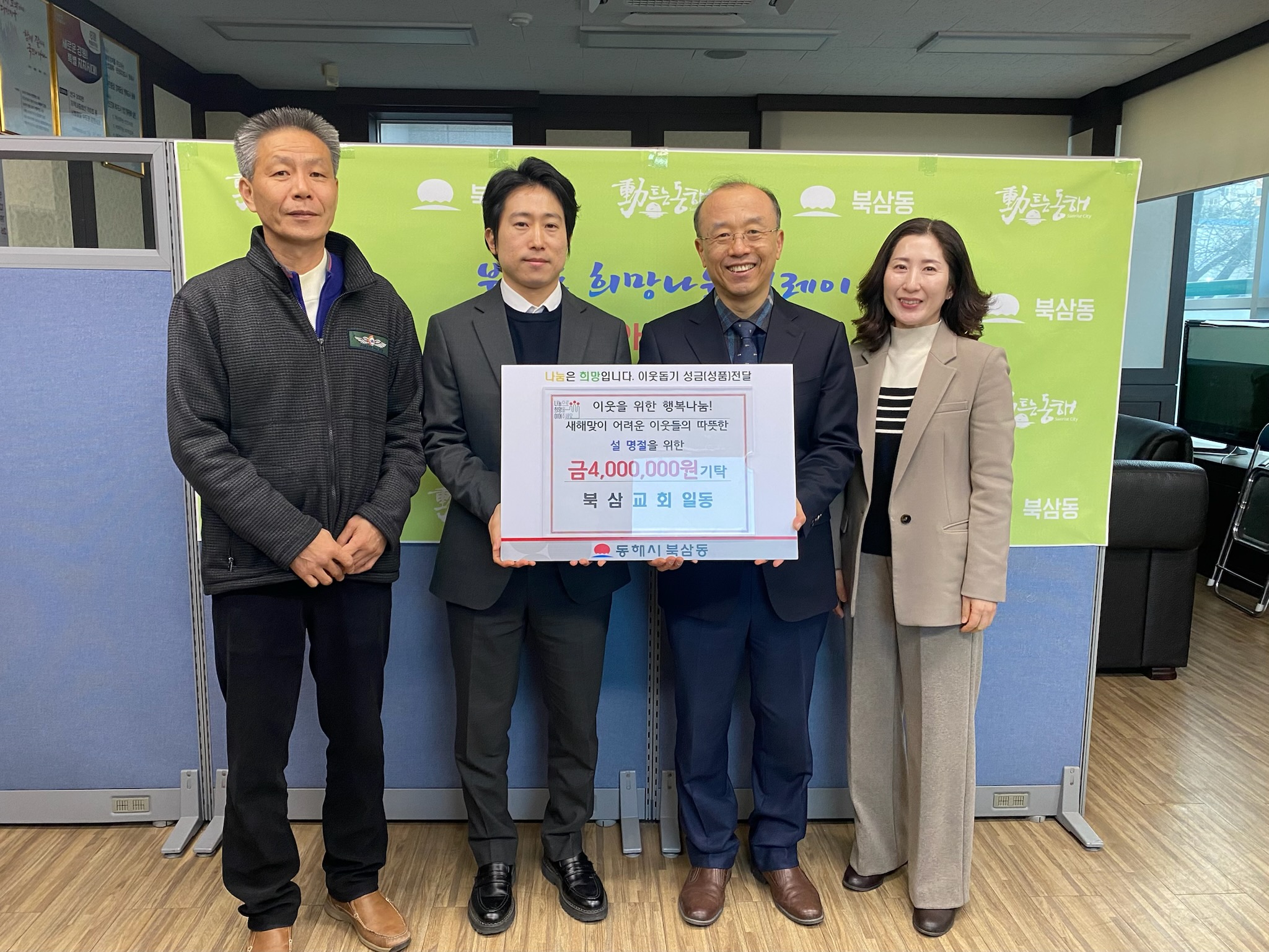북삼교회(담임목사 박권규)는 동해시 북삼동행정복지센터를 방문하여 설 명절 맞이 나눔을 위한 성금 400만 원을 기탁하였다.