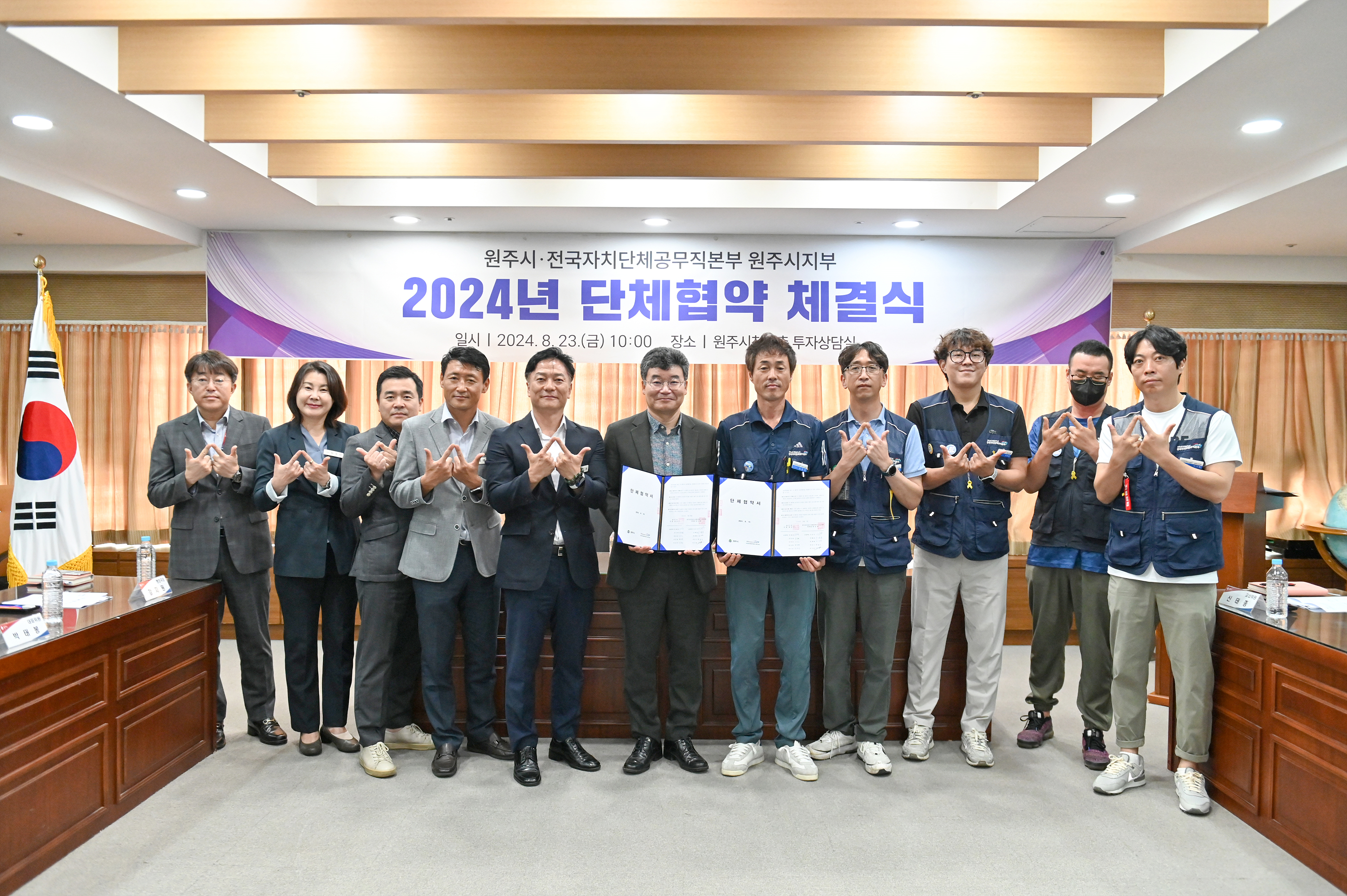 8월 23일(금) 오전 10시 시청 7층 투자상담실 공무직 근로자 근로조건 향상 및 아이 키우기 좋은 근무 환경 조성 중점 원주시는 이달 23일 오전 10시 시청 7층 투자상담실에서 원주시 공무직노동조합과 단체협약을 체결했다. 이날 협약식은 전재섭 원주부시장을 비롯하여 이공우 전국자치단체공무직본부 원주시지부장, 노동조...