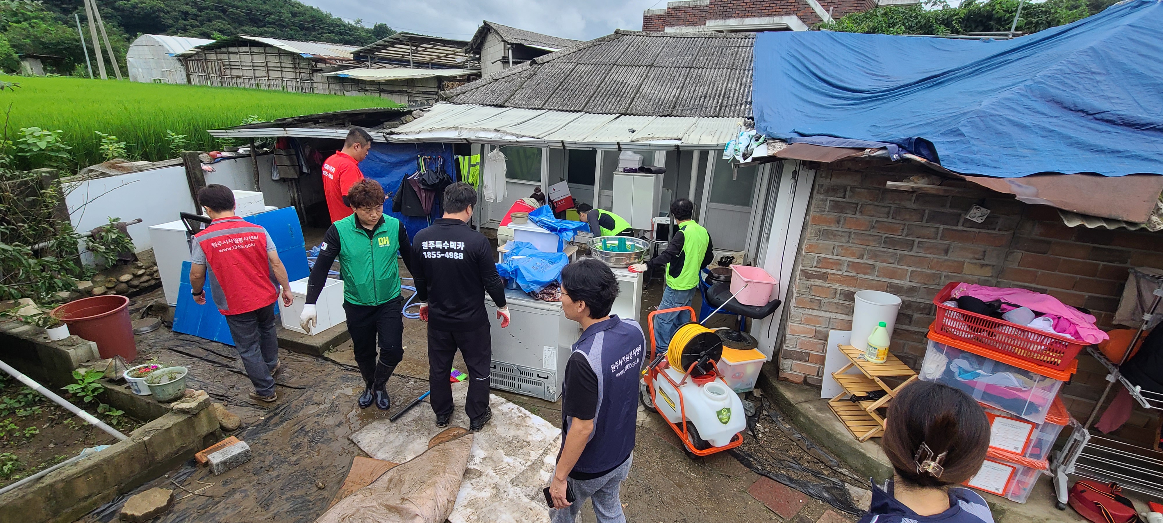 원주시자원봉사센터는 7월 23일, 봉주르원주봉사단, 다함께봉사단, 강원견인차봉사단과 함께 수해 피해를 입은 지정면 수급자 가구를 방문하여 침수 가재 도구 세척 및 건조, 토사 제거, 방역 및 소독 등의 수해복구 봉사활동을 펼쳤다.