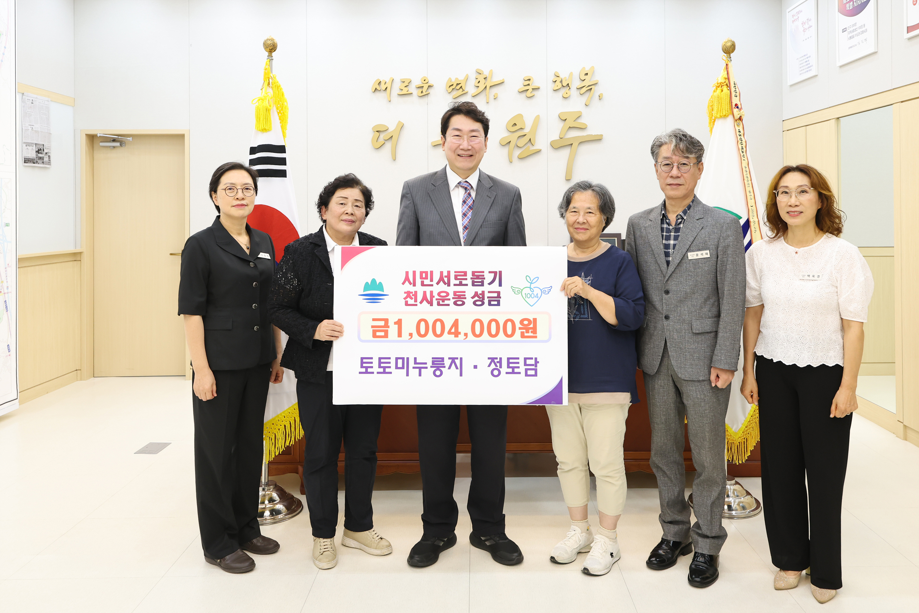 정토담(대표 정영애)과 토토미 누룽지(대표 조재숙)는 7월 19일 오전 9시 원주시장 집무실에서 천사운동 후원금 1,004,000원을 기탁했다. 이날 전달식에는 원강수 원주시장을 비롯하여 정영애 대표, 조재숙 대표 및 천사운동 관계자 등이 참석했다.
