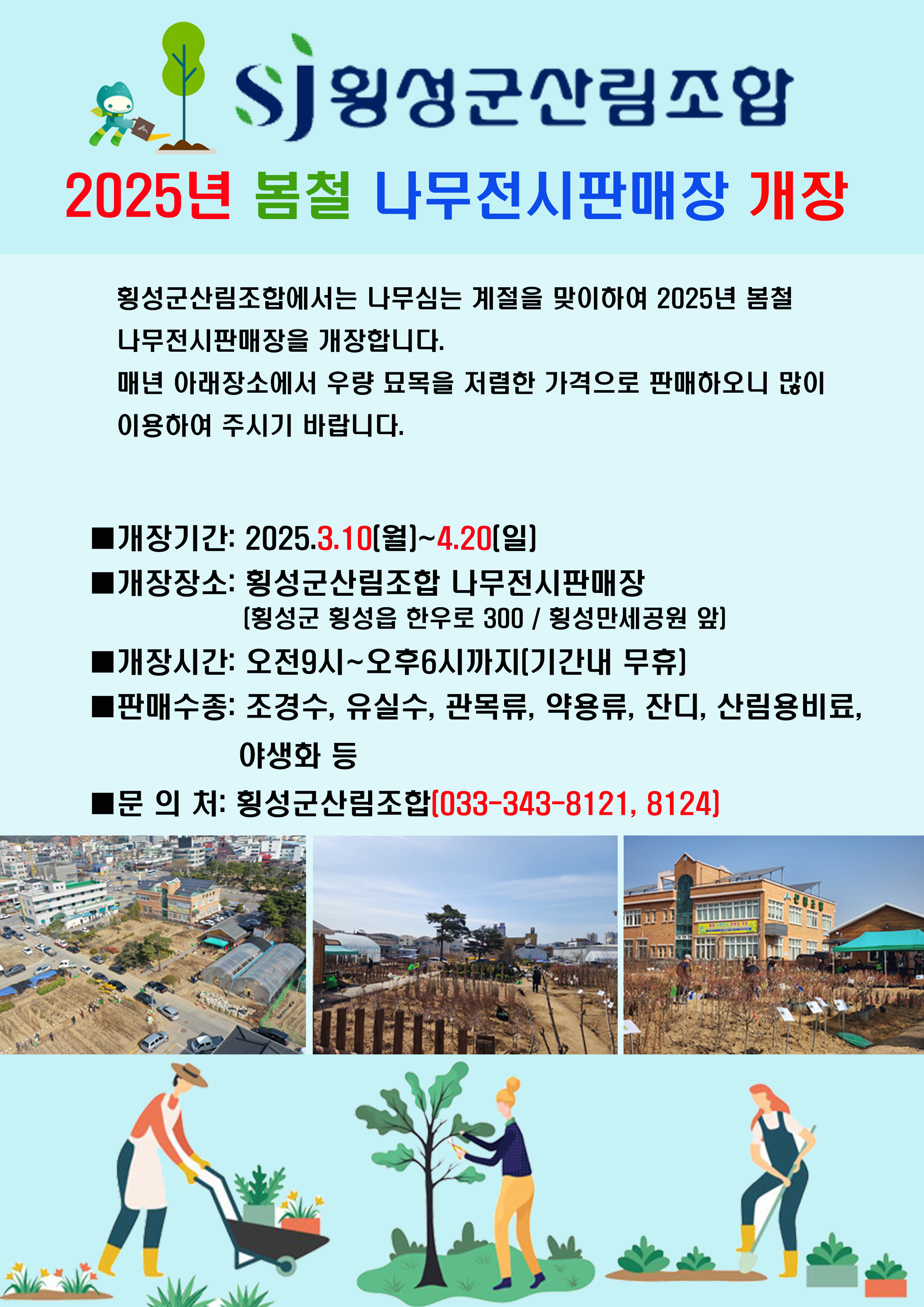 횡성군산림조합(조합장 양재관)은 2025년 3월 10일(월) 오전 9시 나무시장을 개장했다. 개장기간은 3월 10일(월)부터 4월 20일(일) 까지로 횡성군산림조합 나무시장(횡성군 횡성읍 한우로300 )으로 방문하면 된다. 매일 오전9시부터 오후6시까지 개장하며, 기간 내 주말과 휴일에도 이용이 가능하다. 나무시장은 조합원 등이...
