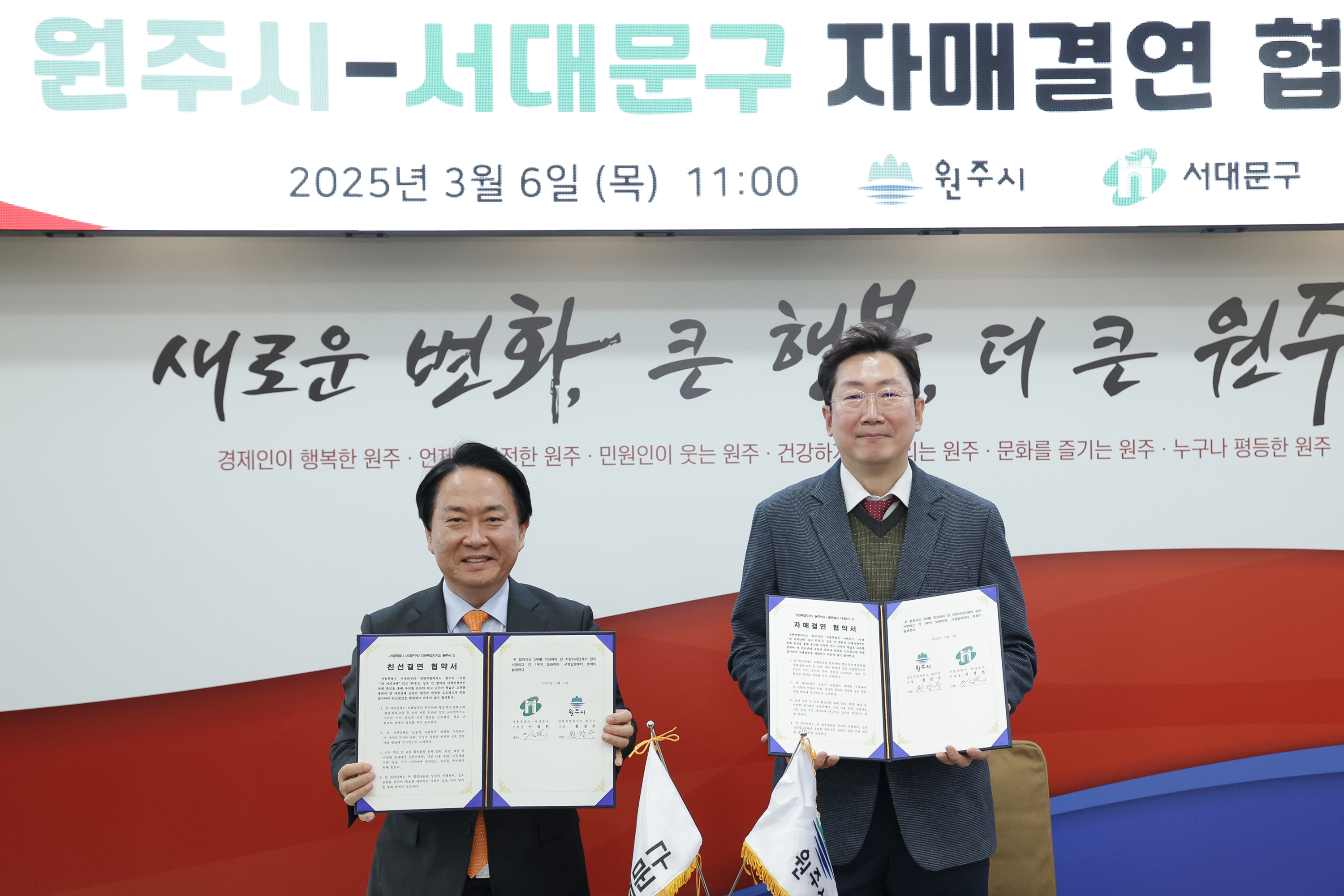 3월 6일(목) 오전 11시, 원주시청 10층 대회의실 돌봄과 교육 혁신 및 농특산물 직거래 등 통해 공동 발전 협력 원주시와 서대문구는 3월 6일(목) 오전 11시 원주시청 10층 대회의실에서 자매결연 업무협약을 체결했다. 이번 자매결연은 국내 도시와의 교류 확대를 통해 폭넓은 네트워크를 구축하고, 다양한 분야의 협력을 통...