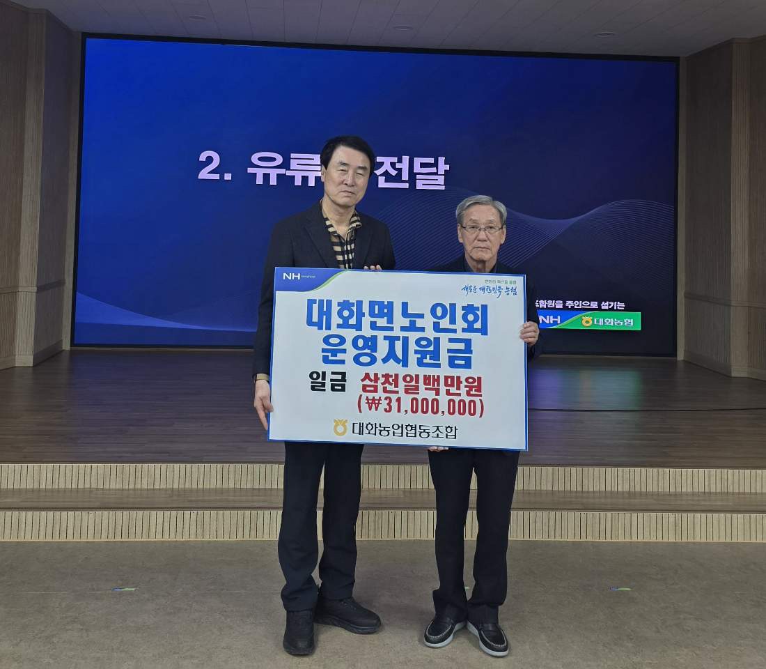 대화농협(조합장 김진복)은 2월 20일 대화농협 회의실에서 대한노인회 대화분회장을 비롯한 각리 노인회 임원을 모시고 대화면 관내 노인회 유류비 전달식을 가졌다. 이날 전달식에서는 대한노인회 대화분회에 300만원, 관내 28개리 노인회에 각 100만원씩 총 3,100만원의 유류비를 지원하였다. 김진복 조합장은 “원로조합원...
