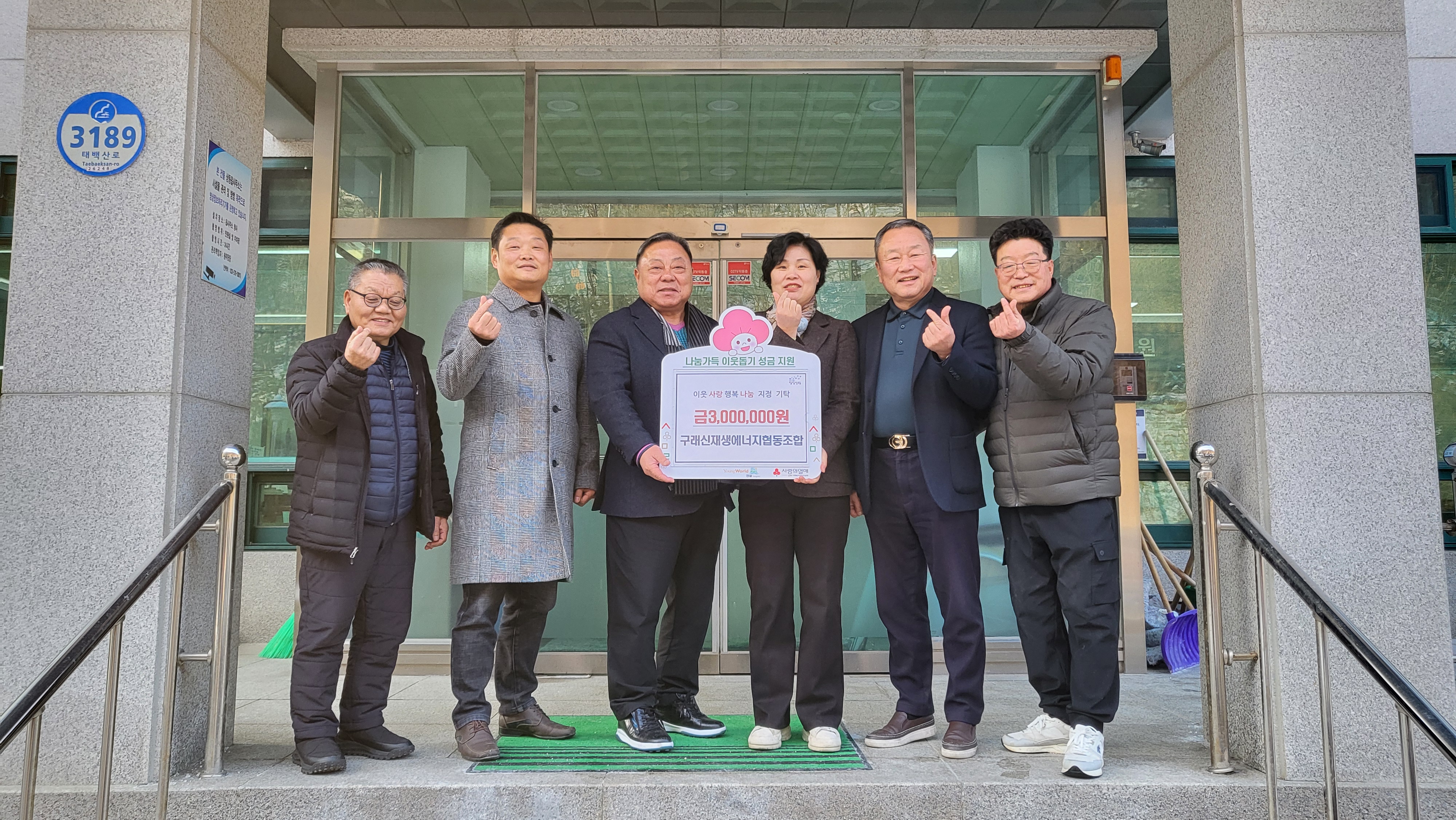 구래신재생에너지협동조합(대표 나병우)이 강원사회복지공동모금회를 통해 영월군 상동읍지역사회복지협의체에 지역주민을 위한 후원금 3백만 원을 기탁했다. 상동읍지역사회보장협의체는 전달받은 후원금을 관내 저소득 주민, 독거노인, 장애인 등 취약계층을 지원하는 복지사업에 사용할 예정이다.