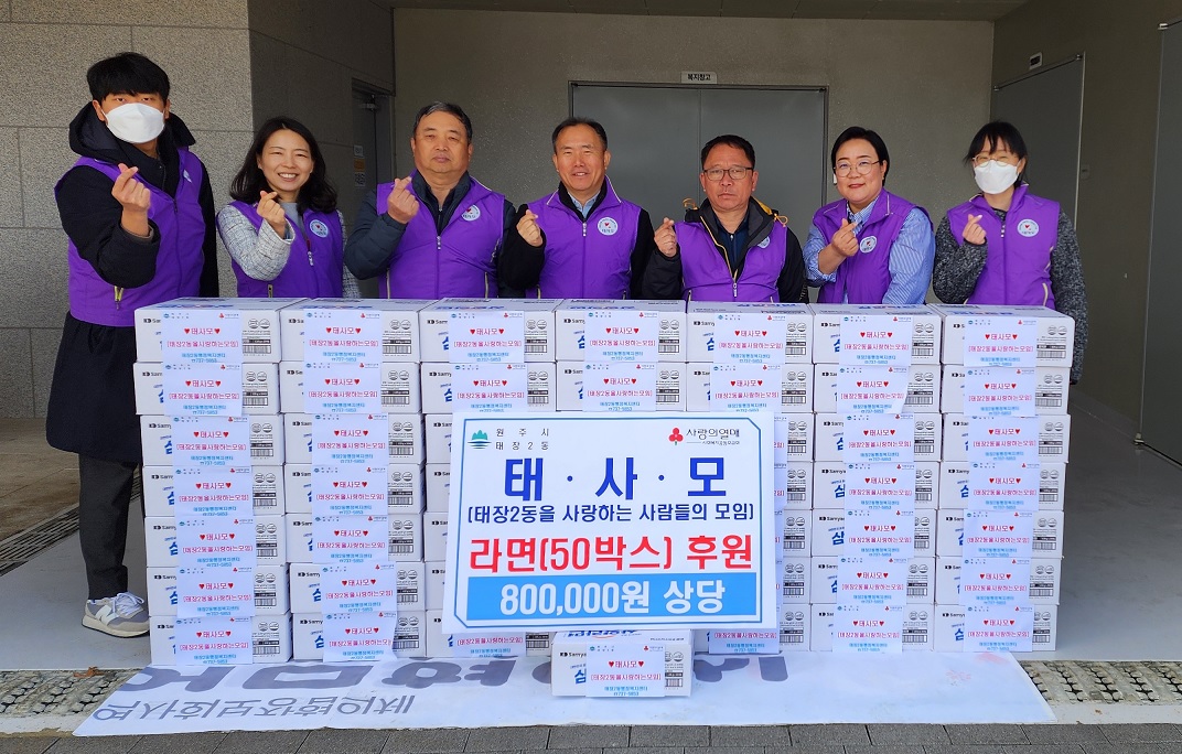 태사모(태장2동을 사랑하는 사람들의 모임, 회장 김학봉)에서는 지난 3월 26일(화) 원주시 태장2동 관내 저소득 소외계층을 위한 라면 50박스를 태장2동 행정복지센터(동장 김영언)에 기탁하였다. 태사모는 관내 저소득 취약계층을 위해 연2회 정기적으로 라면 등 식료품을 기탁할 뿐만 아니라 관내 불우이웃돕기 바자회, 후...
