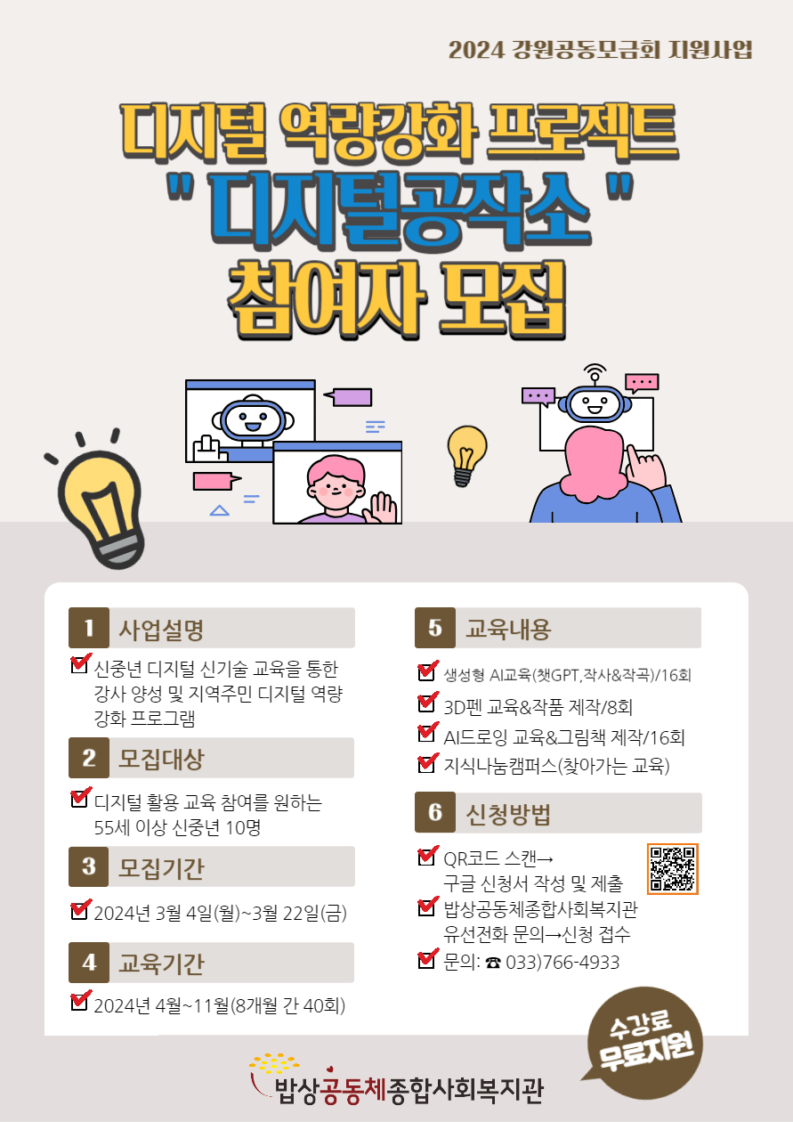 밥상공동체종합사회복지관(관장:허기복)에서는 강원공동모금회 지원 사업 '디지털공작소' 참여자를 모집한다. '디지털공작소'는 디지털 신기술 역량강화 교육을 통해 지역주민 강사를 양성하는 프로그램이다. 55세 이상 신중년 선착순 10명을 모집하고 참여신청은 온라인과 유선 또는 복지관에 내방하여 신청할 수 있다. 프로...