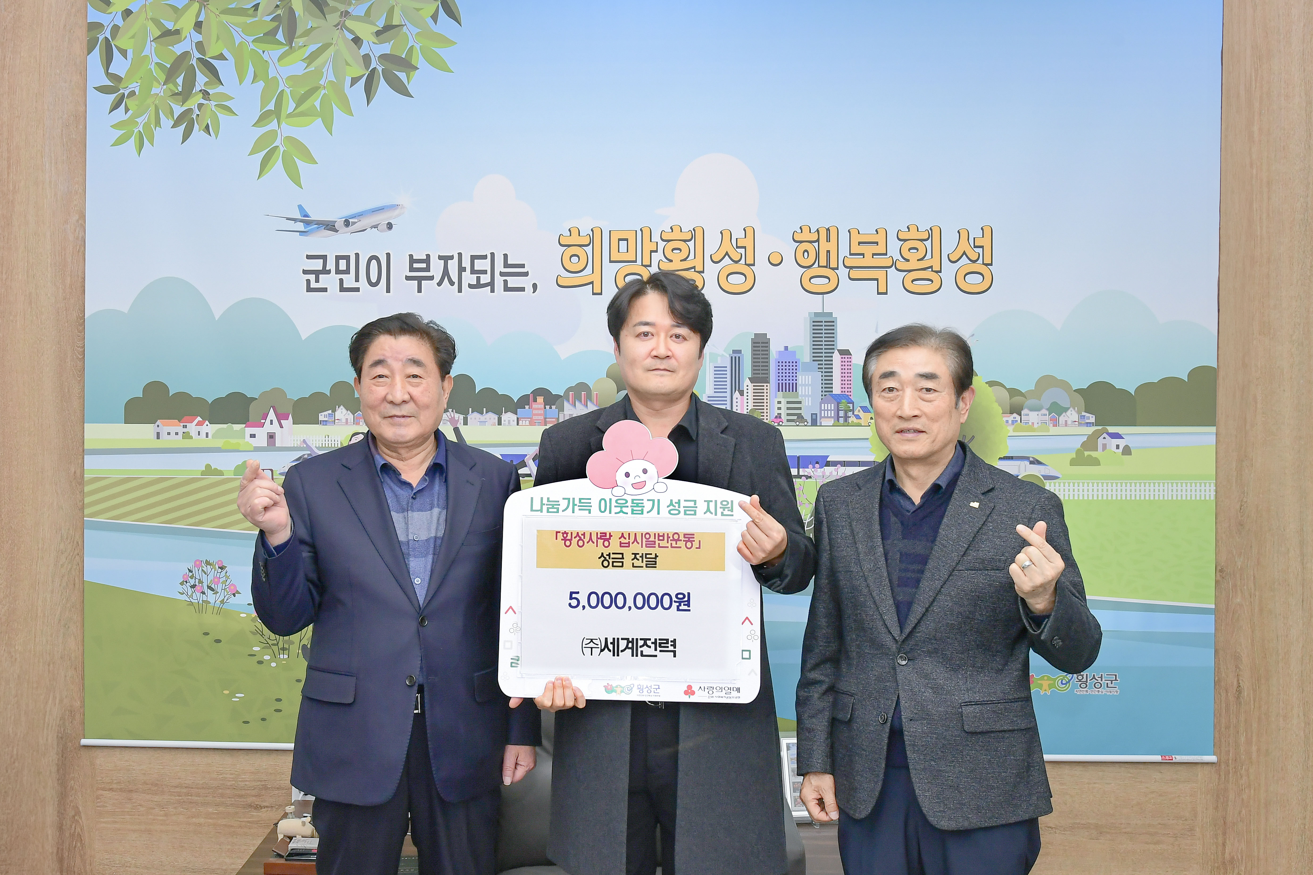 (주)세계전력(대표 박계훈)은 '횡성사랑 십시일반운동'에 동참하는 의미에서 지난 2월 26일 14시 30분 횡성군청을 방문하여 성금 500만 원을 기부했다.