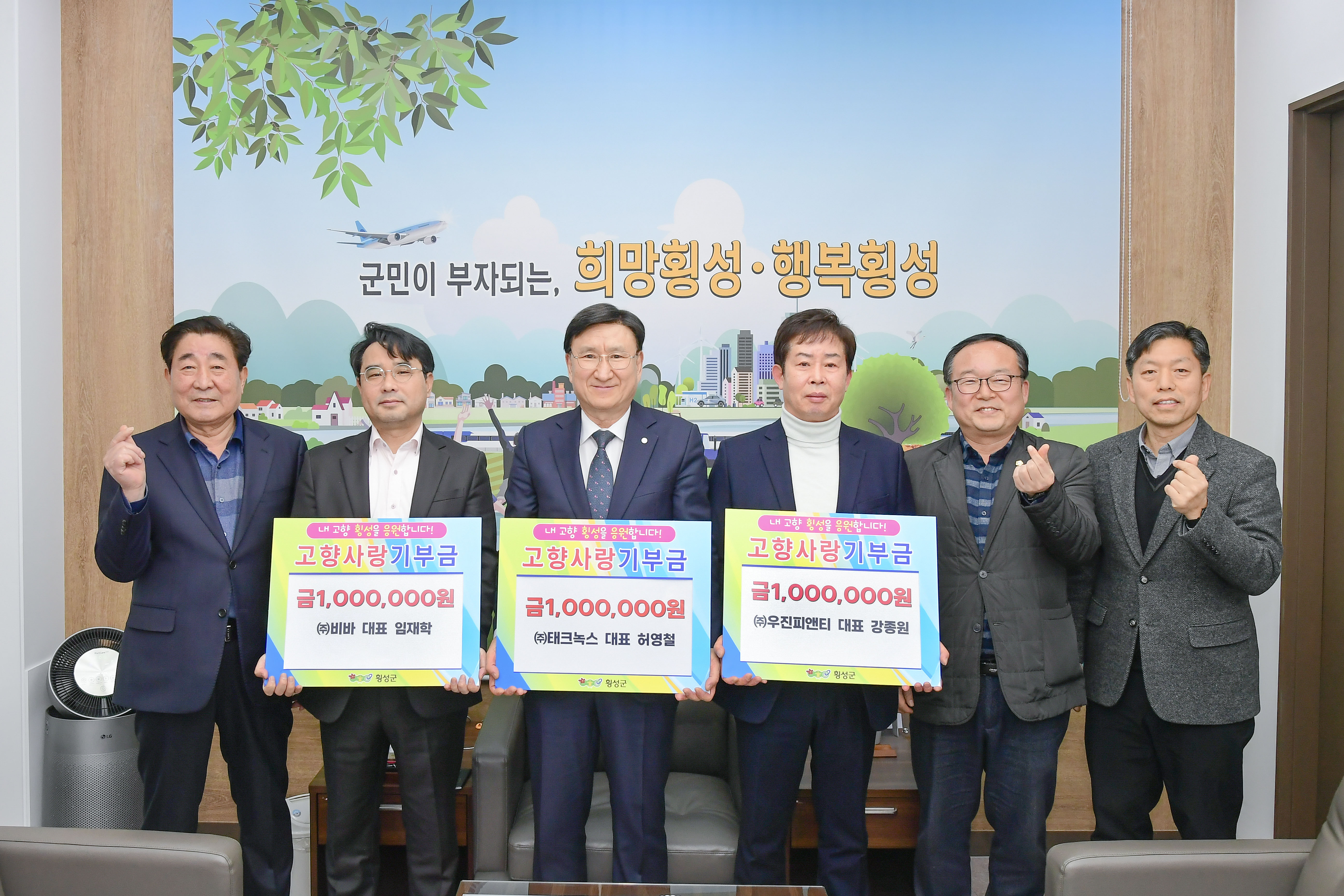 인천 부평구 중소기업협의회(회장 임재학)는 횡성군 고향사랑기부에 참여하기 위해 지난 2월 26일 횡성군청을 방문하여 성금 300백만 원을 전달했다. 이날 기부를 위해 횡성 출신인 부평구 중소기업협의회의 임재학 회장(㈜비바 대표)과 강종원 부회장(㈜우진피앤티 대표), 허영철 감사(㈜태크녹스 대표)가 횡성군을 방문하였...