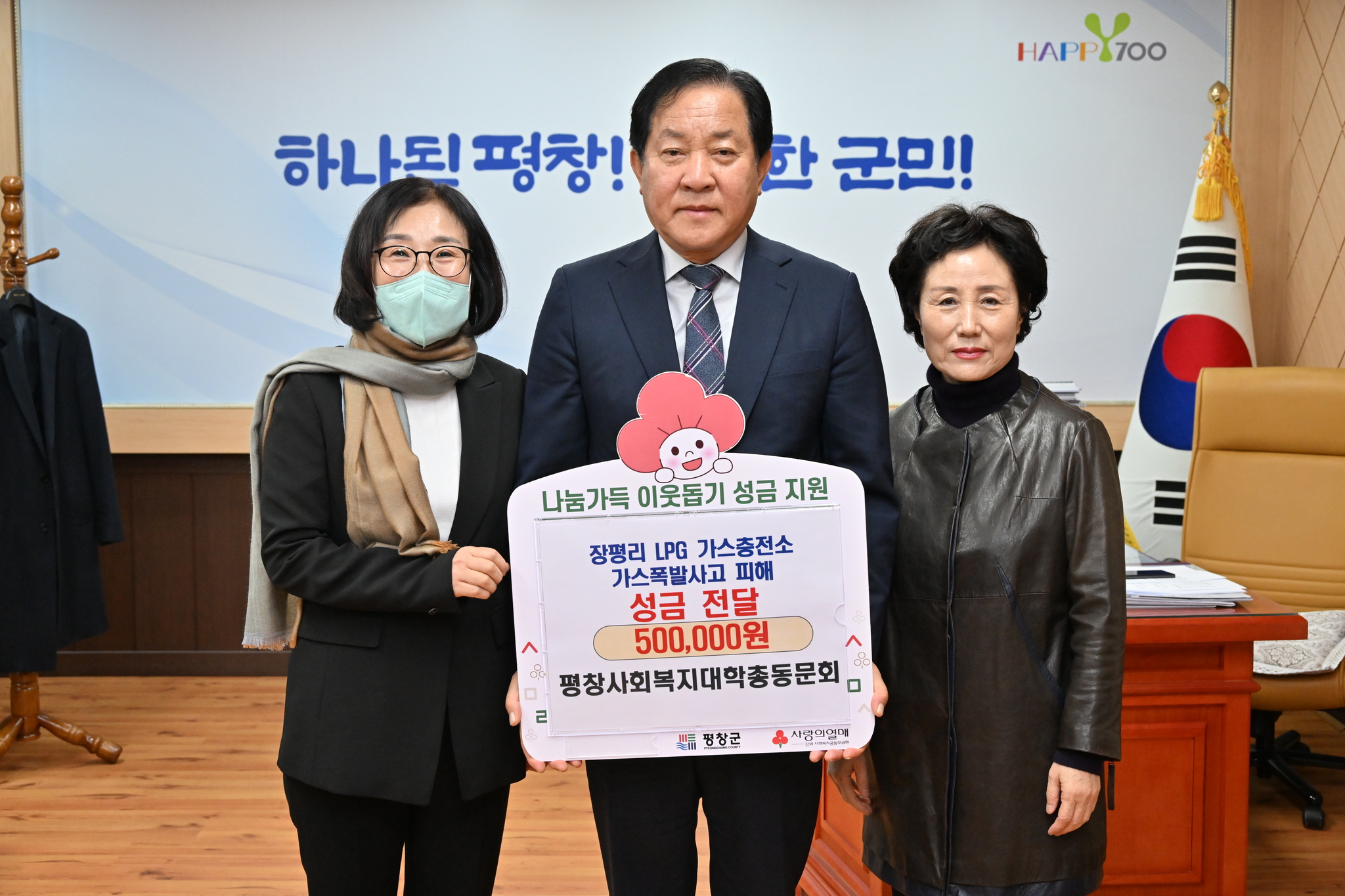 평창사회복지대학총동문회(회장 조옥례)는 지난 2월 14일 평창군 장평리 LPG 가스충전소 가스폭발사고 피해 복구를 위한 성금 500만원을 평창군에 기탁하였다.