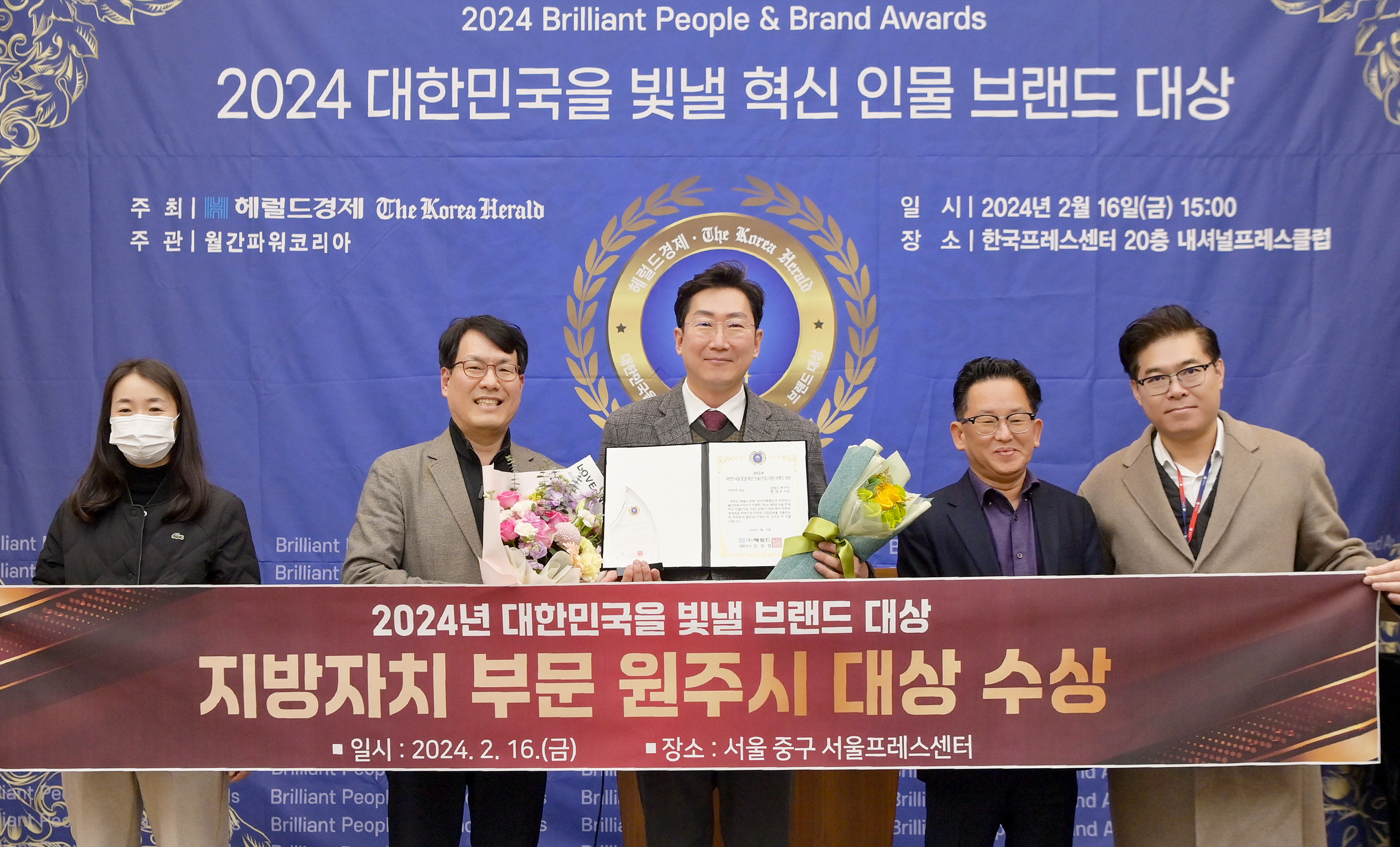 16일 오후 3시, 서울 프레스센터 20층 내셔널프레스룸에서 열려 원주시는 지난 2월 16일 서울 프레스센터에서 열린 '2024년 대한민국을 빛낼 혁신인물(기업/기관)·브랜드 대상' 시상식에서 지방자치부문 대상을 수상하였다. 헤럴드경제와 코리아헤럴드가 주최하고 월간 파워코리아가 주관하는 2024년 대한민국을 빛낼 브랜드...