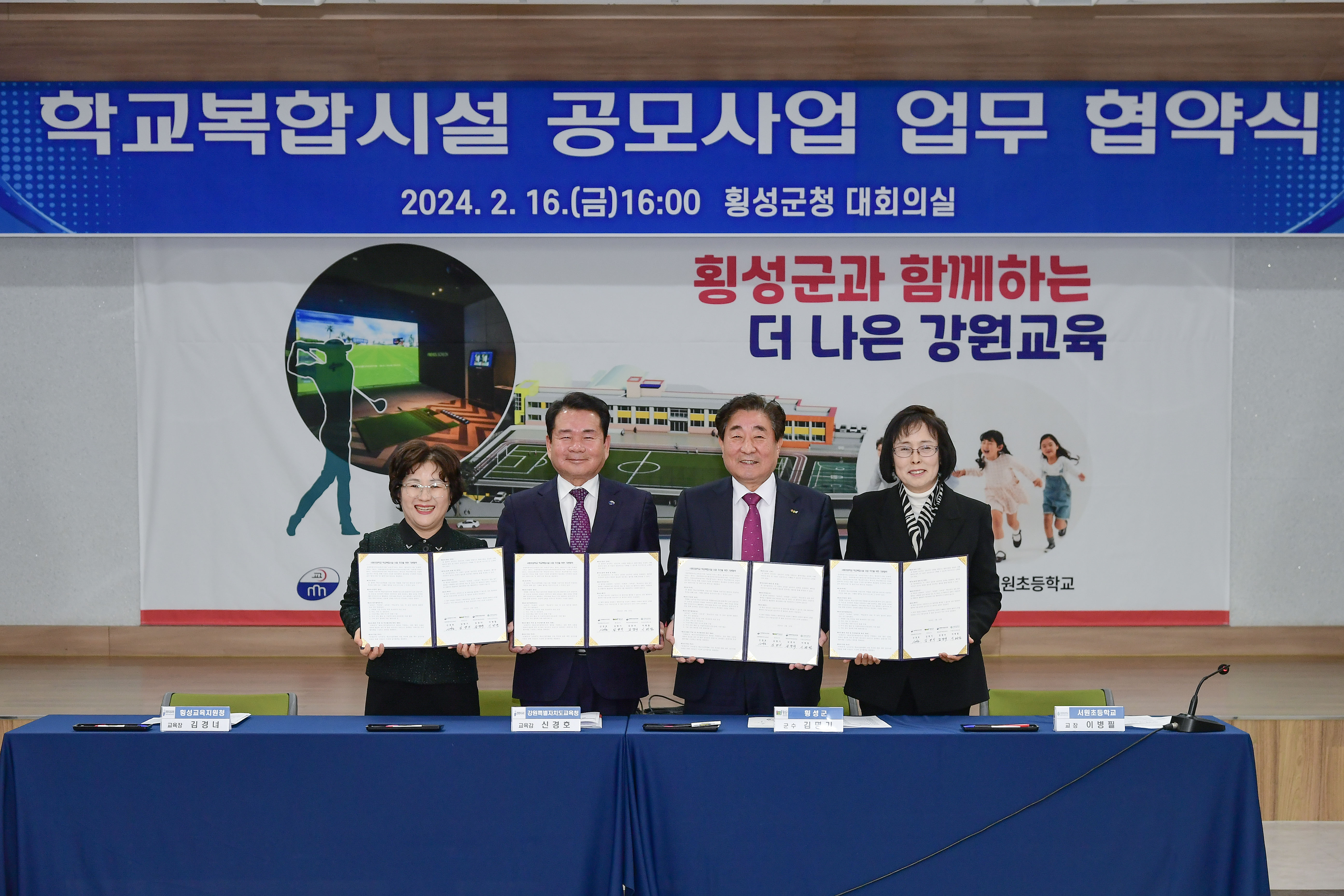 횡성군(군수 김명기)과 강원특별자치도교육청(교육감 신경호), 횡성교육지원청(교육장 김경녀), 서원초등학교(교장 이병필)는 2월 16일 횡성군청에서 교육부 학교복합시설 사업 추진을 위한 업무 협약을 체결했다고 밝혔다. 이날 협약식에는 신경호 교육감와 김명기 군수, 김경녀 교육장, 이병필 교장이 참석하였으며, 학교 ...