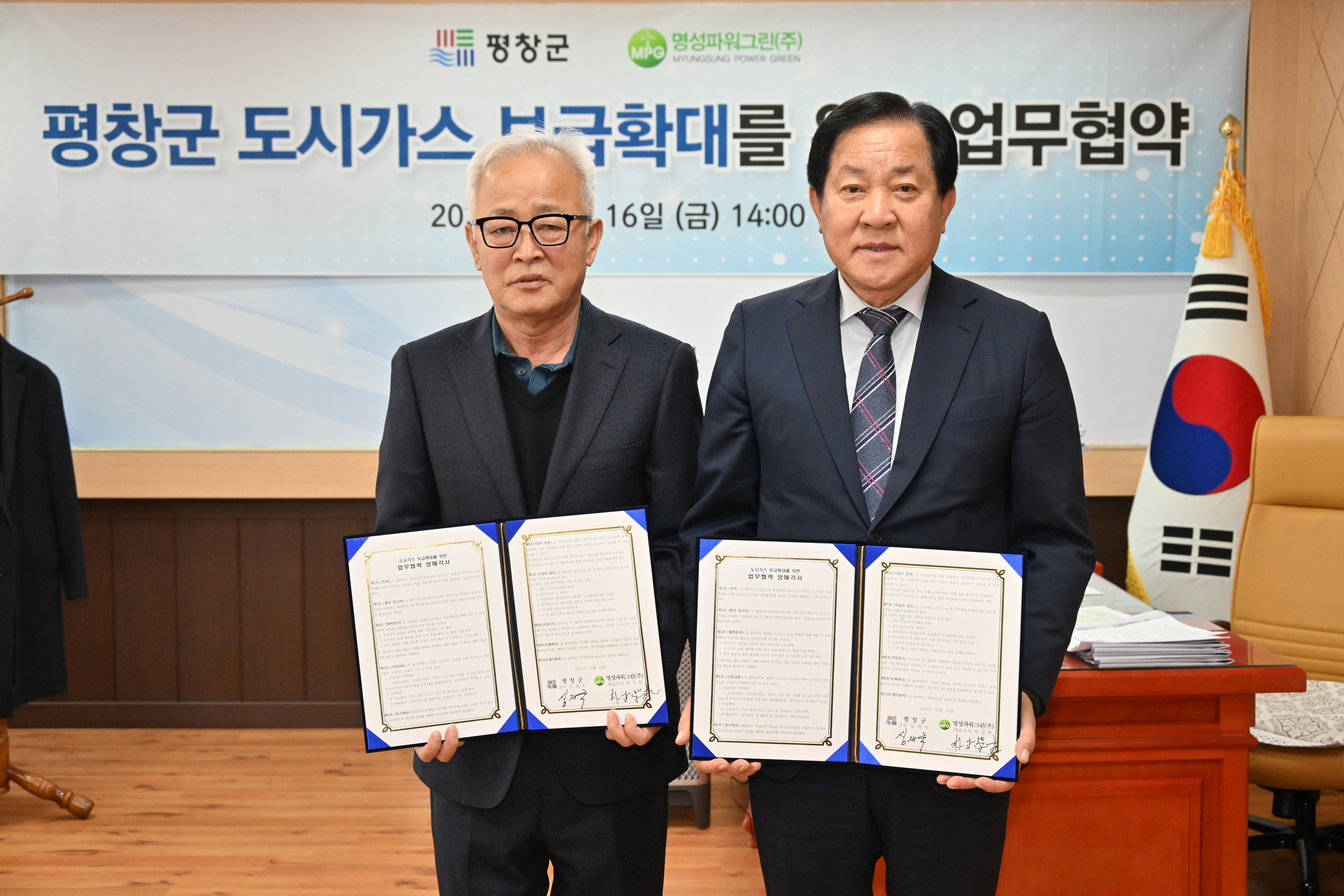 지난 2월 16일 평창군청 군수집무실에서 심재국 평창군수와 박정학 명성파워그린(주) 대표는 평창군 도시가스 보급 확대를 위한 업무협약을 체결했다. 이번 업무협약은 경제성 미달지역인 평창군 미탄면과 방림면을 제외한 6개 읍면에 도시가스를 공급하기 위해 마련되었다. 협약을 통해 평창군과 명성파워그린은 총 620억원...