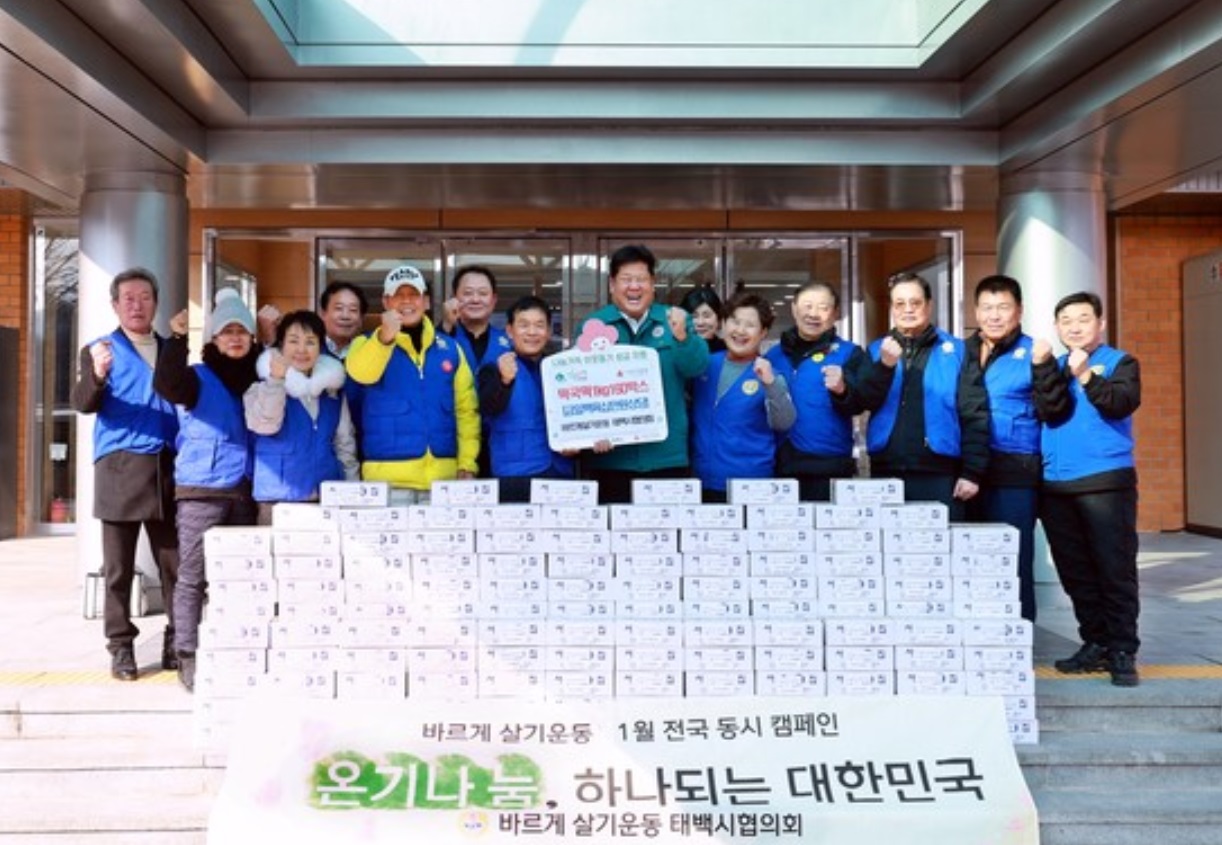 바르게살기운동 태백시협의회(회장 김건희)는 지난 1월 20일 태백시에 관내 저소득층을 위한 떡국떡(1㎏) 160상자(160만 원 상당)를 전달하였다. 한편, 전달받은 떡국떡은 강원공동모금회 배분사업을 통해 태백시 관내 소외계층 및 저소득 가구를 위해 사용될 예정이다.