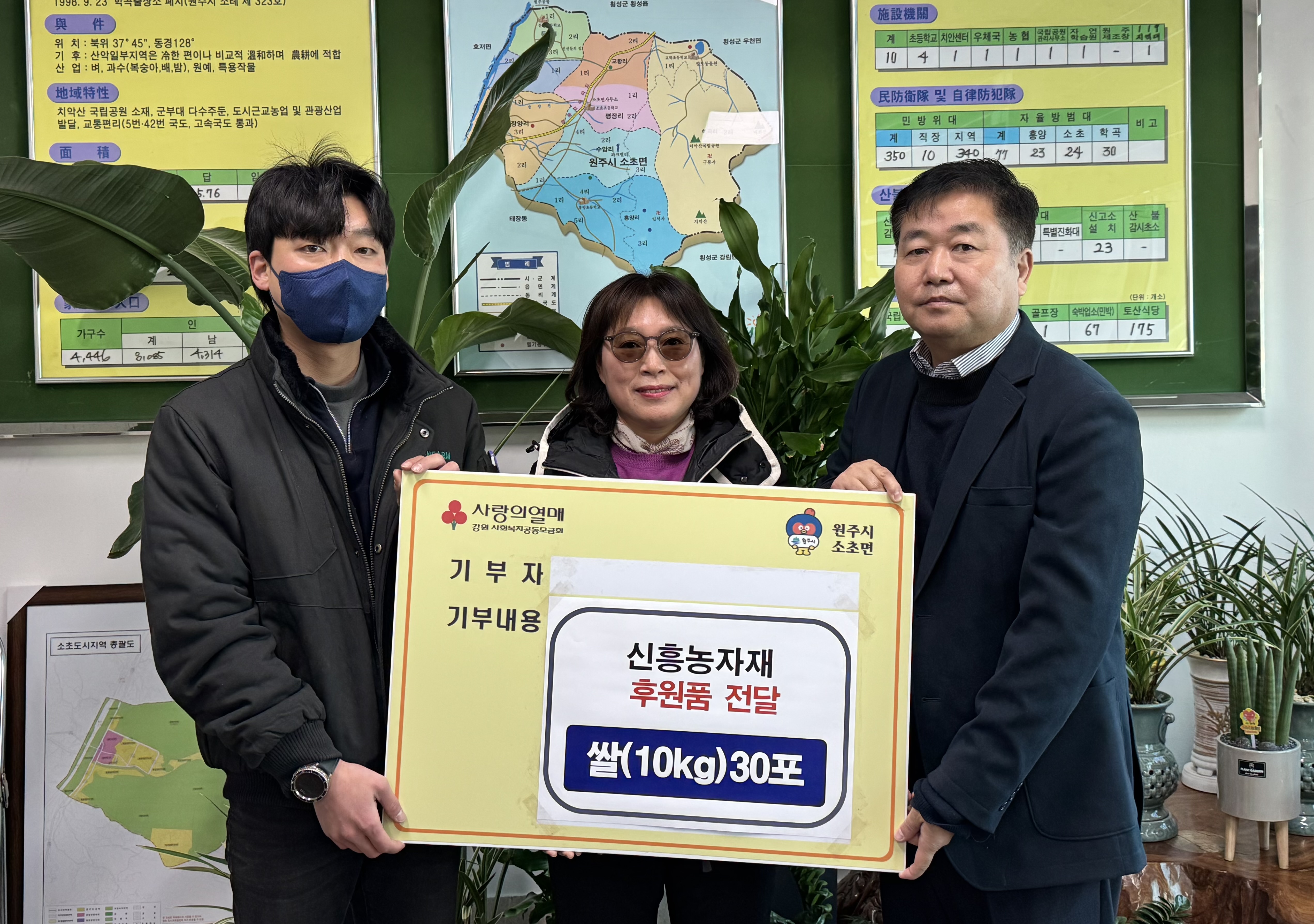 원주시 소초면 신흥농자재(대표 장미영)는 지난 1월 20일 원주시 소초면 관내 저소득층을 위해 90만 원 상당의 양곡(10kg) 30포를 기부했다. 매년 명절마다 기부를 이어오고 있는 장미영 대표는 “명절이 다가옴에도 추운 겨울을 보내고 있을 어려운 이웃들에게 생활 개선에 작게나마 위로가 될 수 있길 바란다.”라고 말했다...