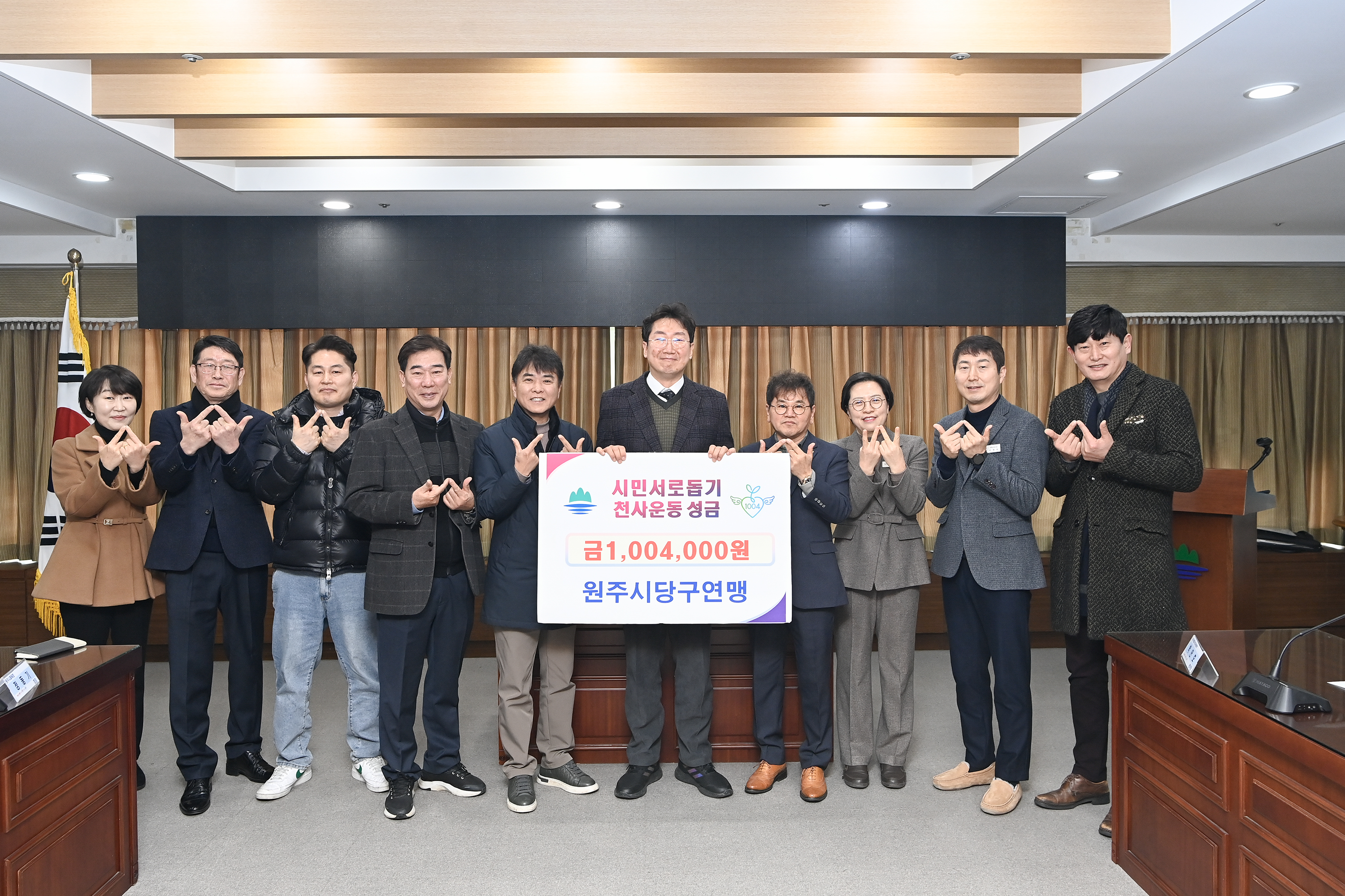 원주시당구연맹(회장 심재현)은 1월 22일 오전 10시 원주시청 7층 투자상담실에서 천사운동 후원금 100만 4,000원을 기탁했다. 이날 전달식에는 원강수 원주시장을 비롯해 원주시당구연맹 심재현 회장, 전무이사, 원주시체육회장 및 천사운동 관계자 등이 참석했다. 한편 원주 시민서로돕기 천사운동은 ‘시민 1인, 1계좌, 1...