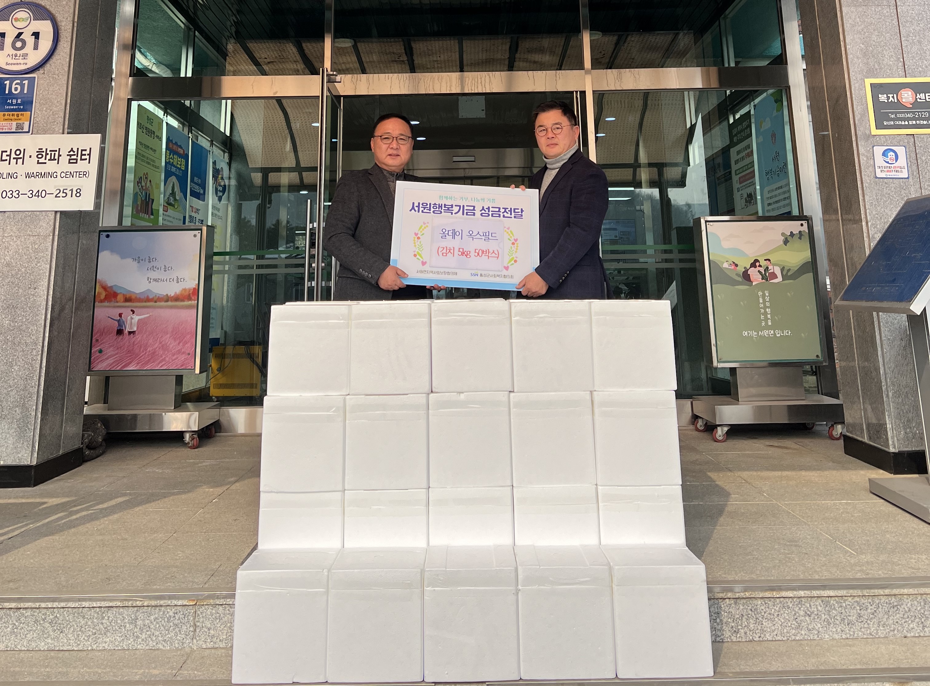 올데이 옥스필드CC(대표 조창호)는 1월 21일 횡성군 서원면행정복지센터를 방문해 김치(5kg) 50박스를 ‘서원행복기금’에 기부했다. 기부한 김치 50박스는 서원면 사회취약계층에 지원될 예정으로 올데이 옥스필드는 지난해 서원면에 김치 100박스, 1,000만 원을 기부하는 등 더불어 사는 사회를 위해 꾸준한 활동을 펼쳐오...