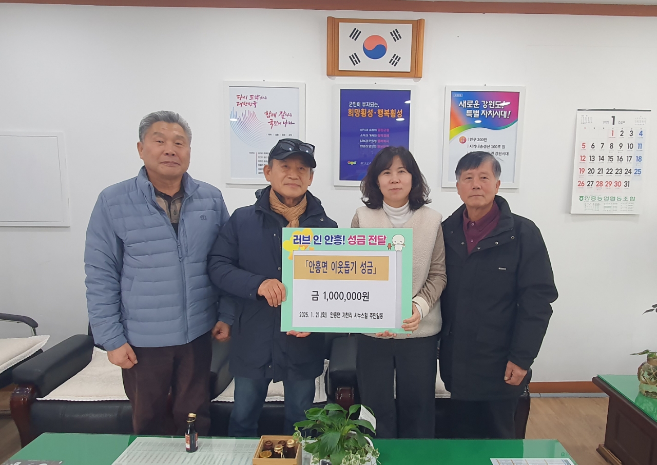 횡성군 안흥면 가천리(이장 김준섭) 사누스힐 주민들이 1월 21일 안흥면 행정복지센터를 방문해 어려웃 이웃을 위해 써달라며 러브인안흥기금에 100만 원을 기부했다.