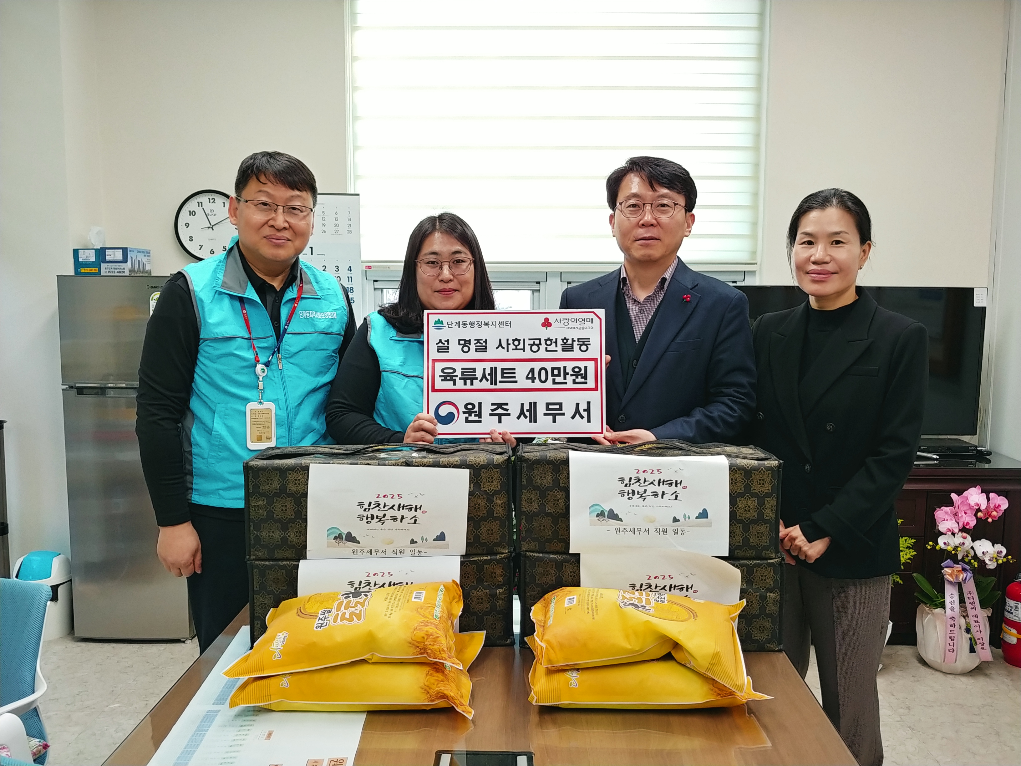 원주세무서(서장 김광대)는 설을 앞두고 지난 1월 21일(화) 원주시 단계동 행정복지센터를 방문해 관내 저소득 4가구에 각 10만 원 상당의 정육 세트와 백미 4kg을 전달했다. 이번 후원품은 원주세무서 직원들이 십시일반 모은 성금으로 마련됐으며, 원주세무서는 어려운 이웃들이 따뜻하고 풍성한 명절을 보낼 수 있도록 지...