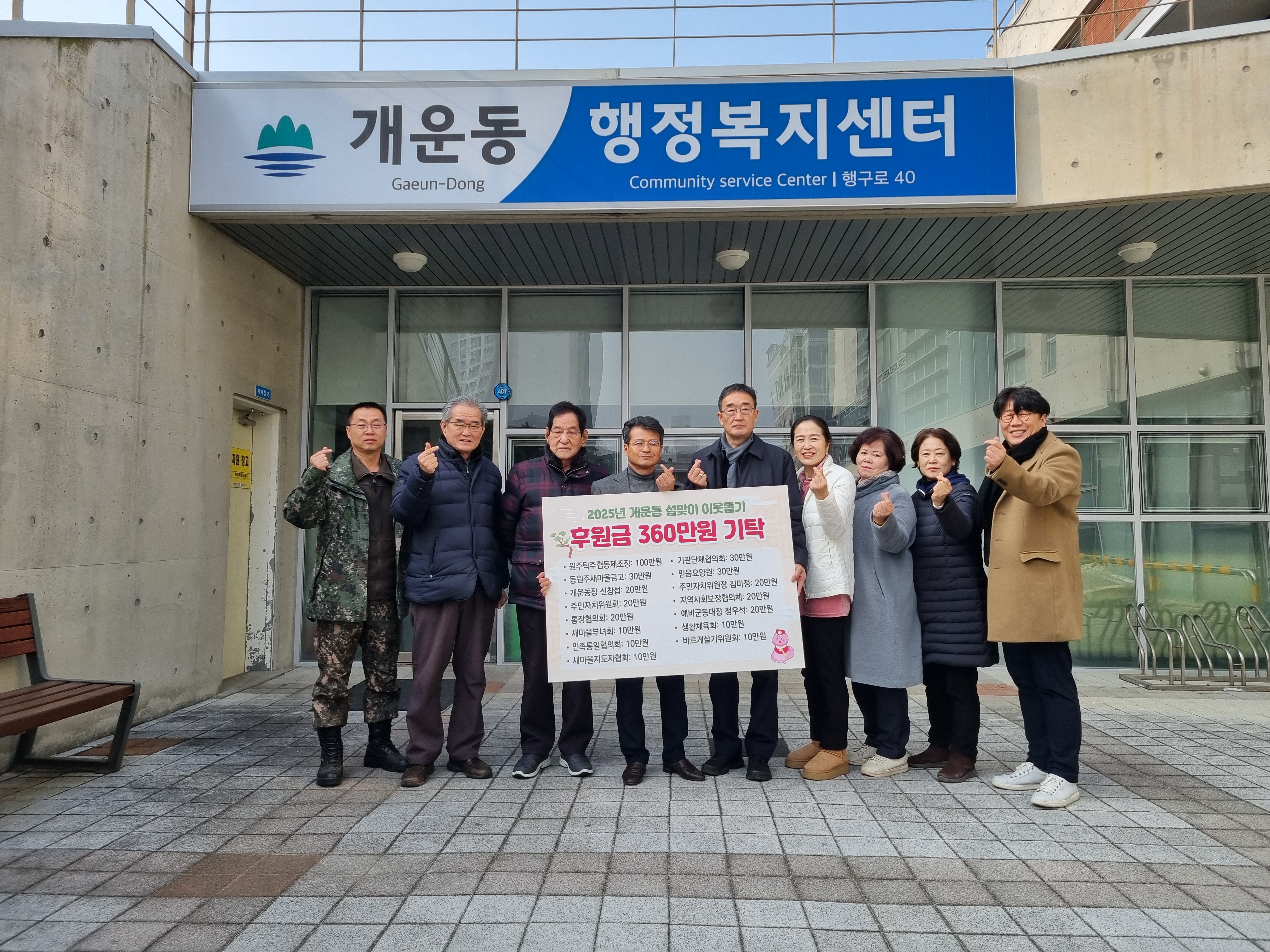 원주시 개운동에 소재한 원주탁주합동제조장(대표 이강부)을 비롯한 15개 기관·단체는 민족 고유의 명절인 설을 앞두고 지난 1월 21일 원주시 개운동 행정복지센터를 방문해 저소득층 이웃돕기 후원금 총 360만 원을 기탁했다. 원주탁주합동제조장 100만원, 개운동기관단체협의회, 동원주새마을금고, 믿음요양원 각 30만원,...