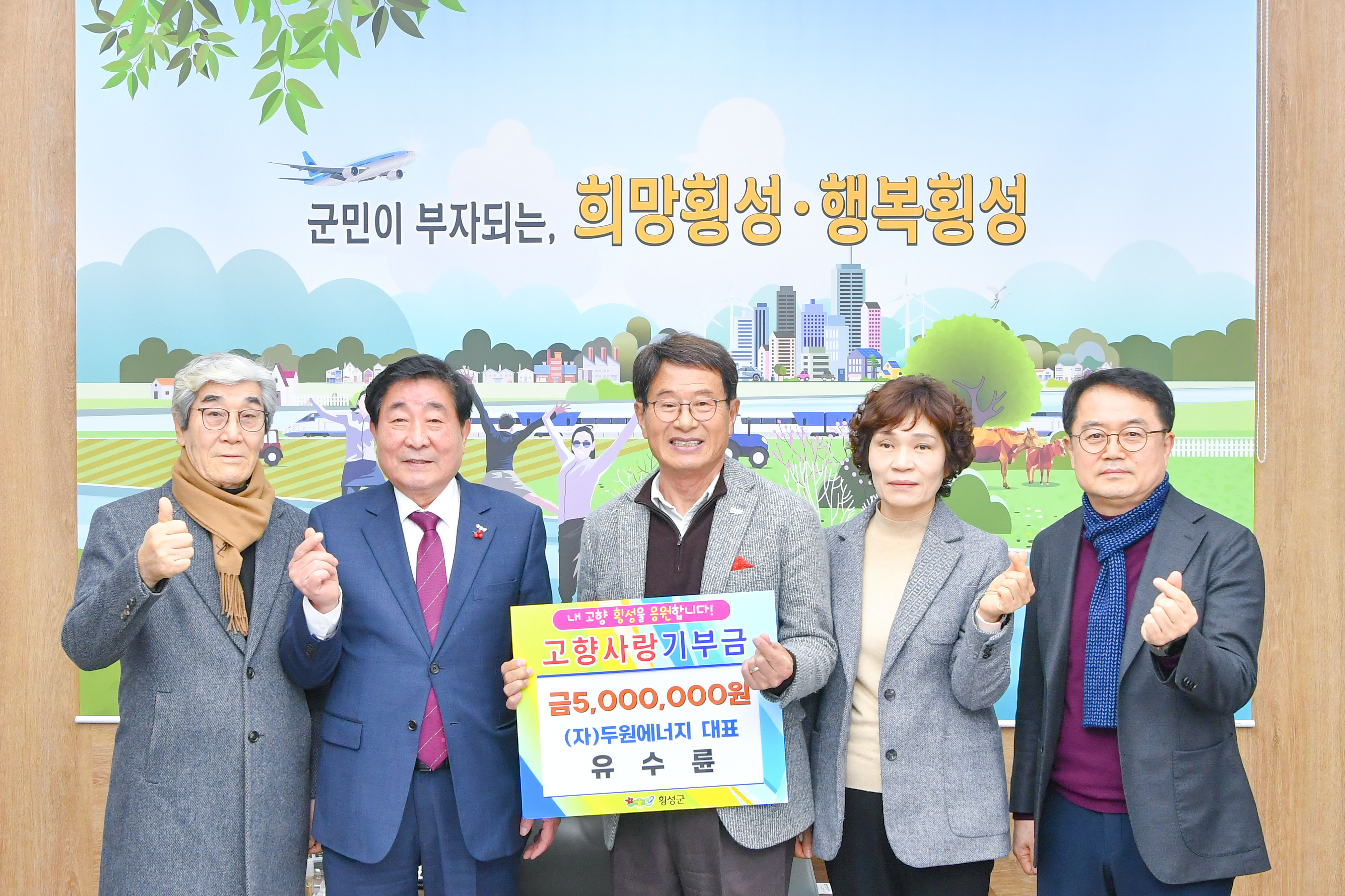 (주)두원에너지(대표 유수륜)은 지난 1월 21일 오후 5시 횡성군청을 방문해 고향사랑기부금 500만 원을 기탁했다.