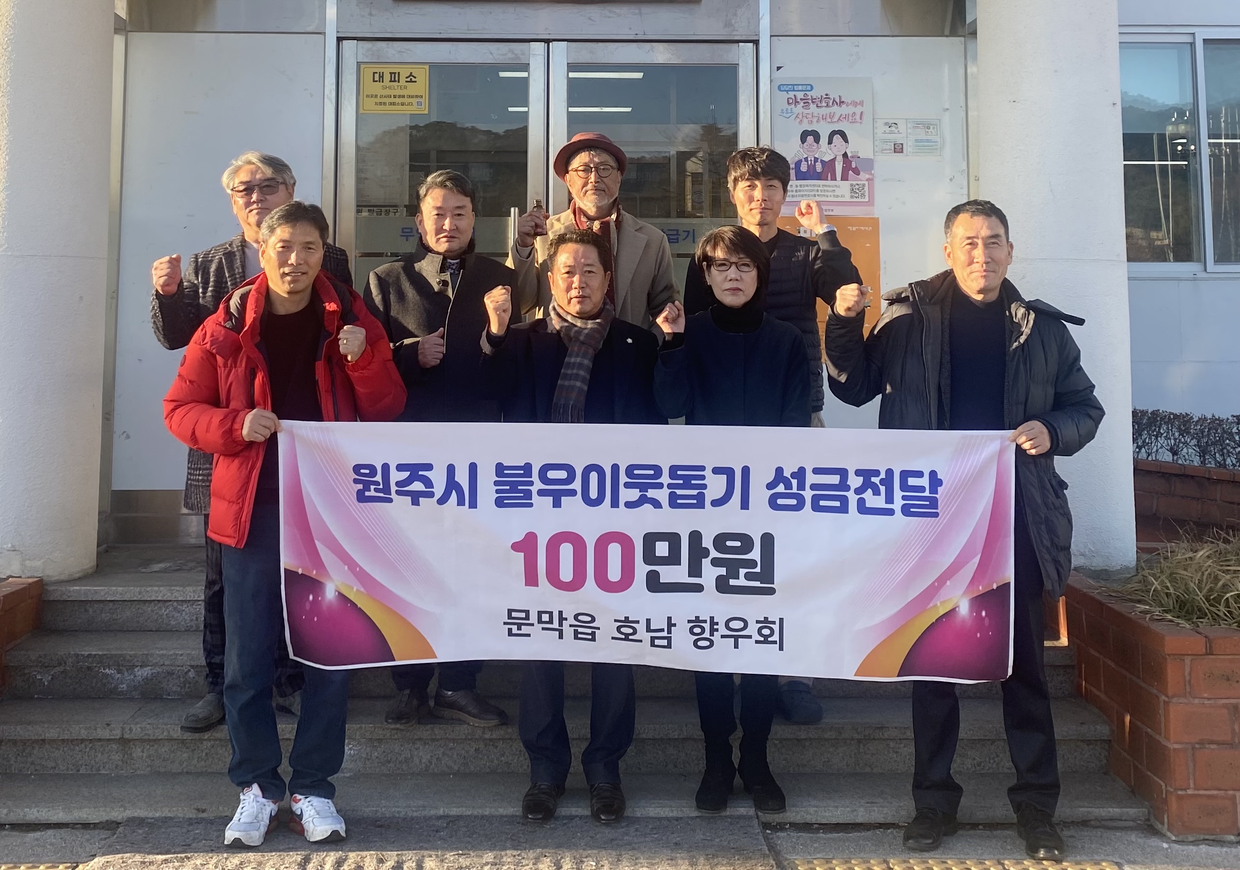 원주시 문막 호남향우회(회장 임자택)는 지난 1월 15일 문막읍 행정복지센터를 방문해 관내 어려운 이웃을 위한 후원금 100만 원을 기탁했다. 이번 후원금은 문막읍지역사회보장협의체에서 추진하는 특화사업 등 취약계층들을 위한 지원사업에 사용될 예정이다. 한편 문막 호남향우회는 7년 전 호남 출신 주민들이 모여 결성...