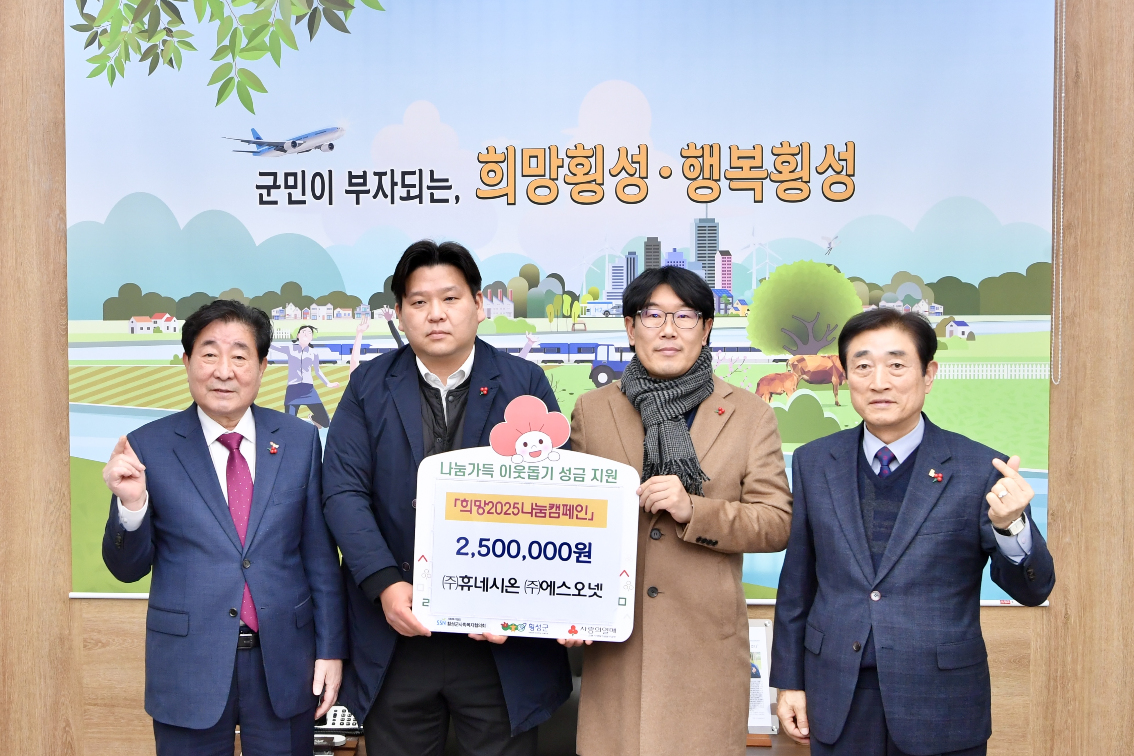 (주)휴네시온(대표 정동섭)과 (주)에스오넷(대표 박용복)은 1월 15일 16시10분 횡성군청을 방문해 ‘희망2025나눔캠페인’ 성금 250만 원을 공동 기탁했다.