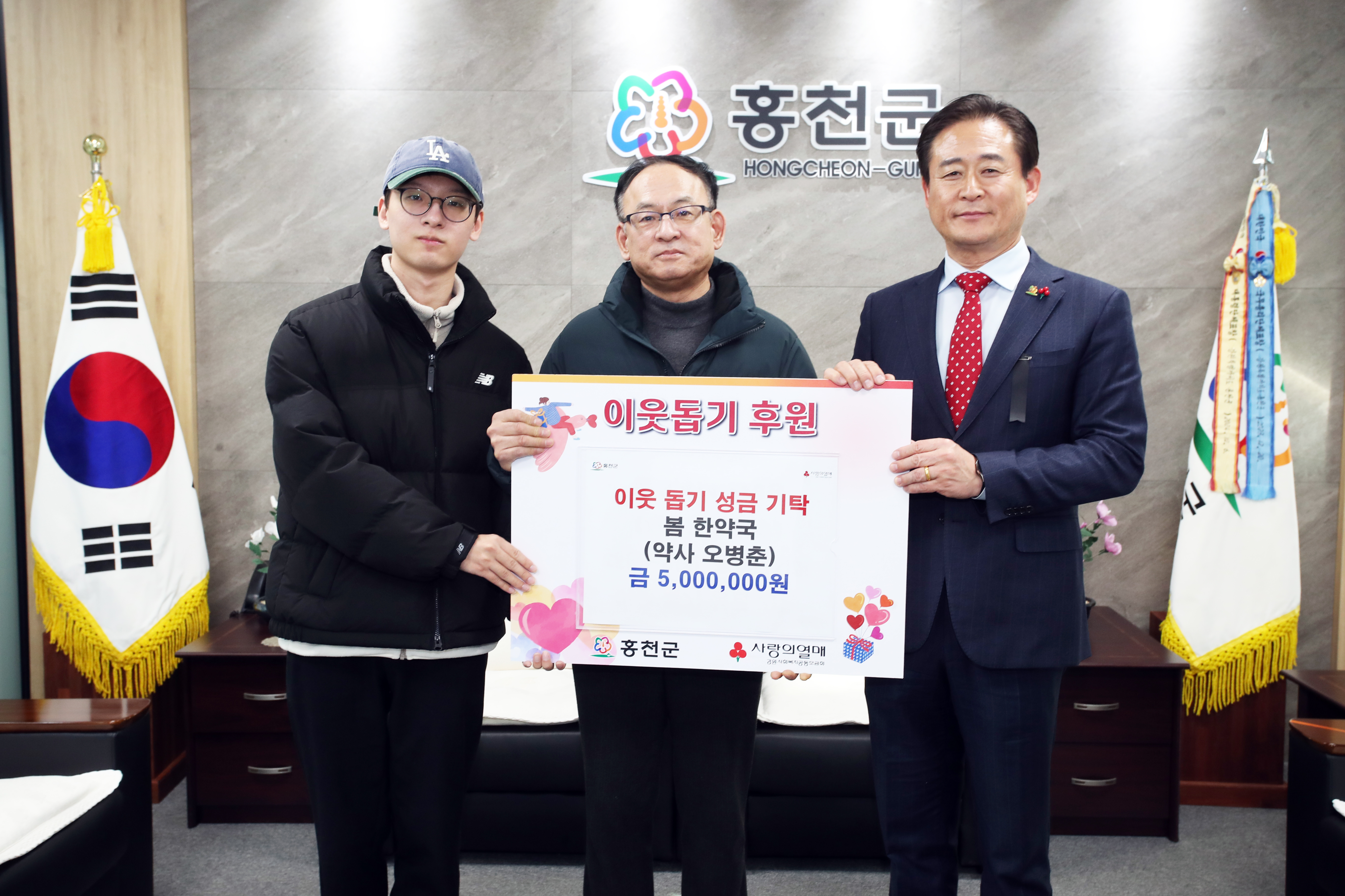 봄 한약국(약사 오병춘)은 1월 2일 홍천군청을 방문하여, 어려운 이웃돕기 성금 500만원을 기탁했다. 오병춘 약사는 “홍천군의 어려운 이웃분들이 행복한 새해를 맞이하기를 바라는 마음에 성금을 기탁하게 되었다”라며 “성금이 도움이 필요한 곳에 잘 전달되기를 바란다”라고 말했다. 신영재 홍천군수는 “따뜻한 마음이...