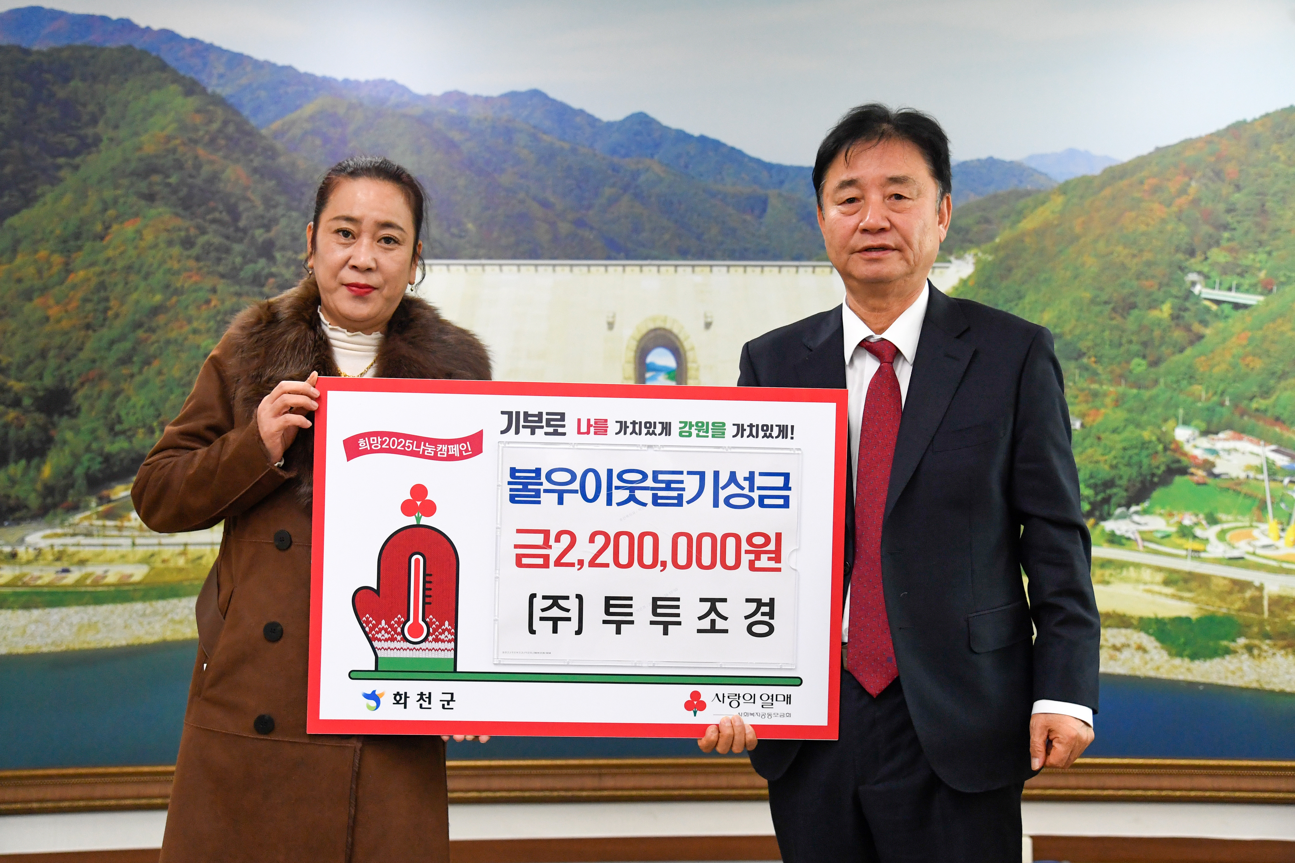 투투조경(대표:이선미)은 지난 12월 31일 최문순 화천군수를 방문해 이웃돕기 성금 220만원을 기탁했다.
