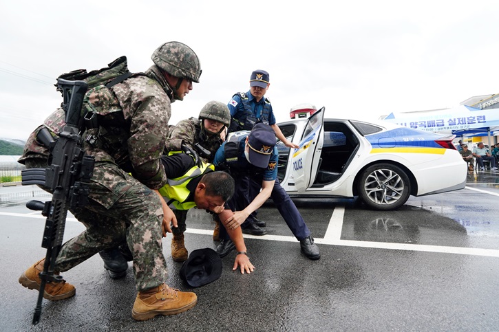 양구군은 2024년 을지연습이 실시되고 있는 가운데 지난 8월 21일 강원특별자치도 양구군 농업기술센터 주차장에서 전시상황시 양곡배급 실제훈련을 실시했다. 양곡배급소에서 양곡을 탈취 시도한 괴한이 경계중인 군부대 요원에게 제압 당한 후 신고를 받고 출동한 경찰에게 인계되고 있다.