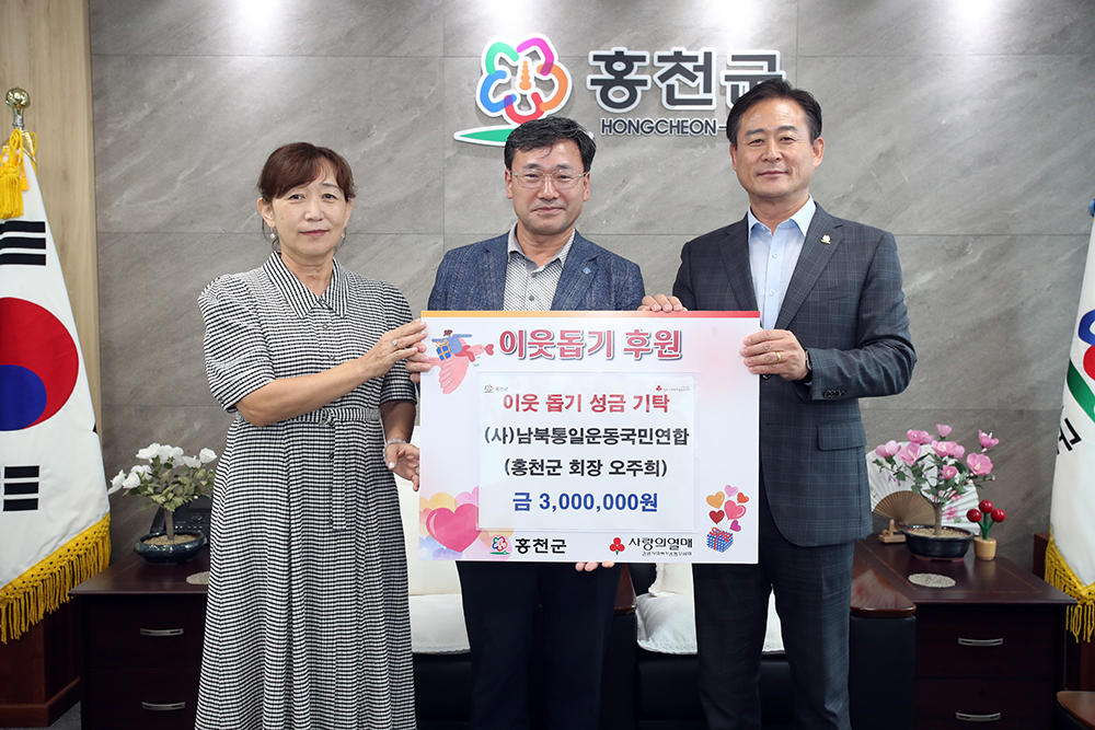 (사)남북통일운동국민연합 홍천군지회(회장 오주희)는 지난 7월 18일, 홍천군청을 방문하여 이웃돕기 성금 300만원을 기탁했다. 오주희 회장은 “홍천군의 어려운 이웃들에게 조금이나마 도움이 되기를 바라는 마음에서 남북통일운동국민연합 홍천군지회 회원들과 뜻을 모으게 됐다.”고 말했다. 신영재 홍천군수는 “올해에...