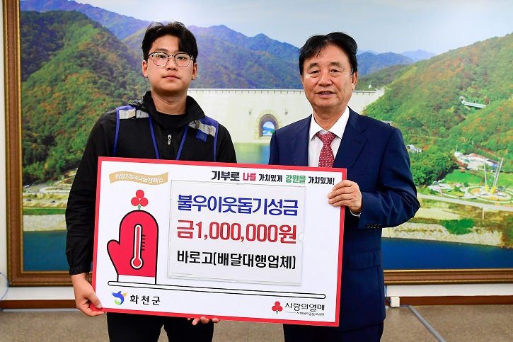 배달 대행업체 ‘바로고’ 화천점(대표:김휘종)은 지난 6월 27일 최문순 화천군수를 방문해 이웃돕기 성금 100만원을 기탁했다.