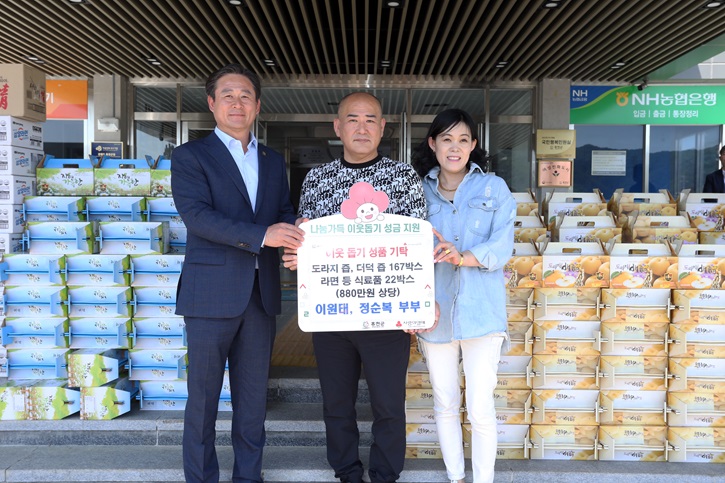 이원태·정순복 부부가 지난 5월 3일 홍천군청을 방문하여 도라지 즙 104박스, 더덕 즙 63박스와 식료품 22박스 등 880만원 상당의 물품을 기탁했다. 이원태 씨는 “어버이날과 어린이날을 맞아 독거노인 분들과 아이들에게 선물을 하고 싶어 기탁하게 되었다.”며, “더불어 사는 사회가 되었으면 좋겠다.”고 말했다. 신영...