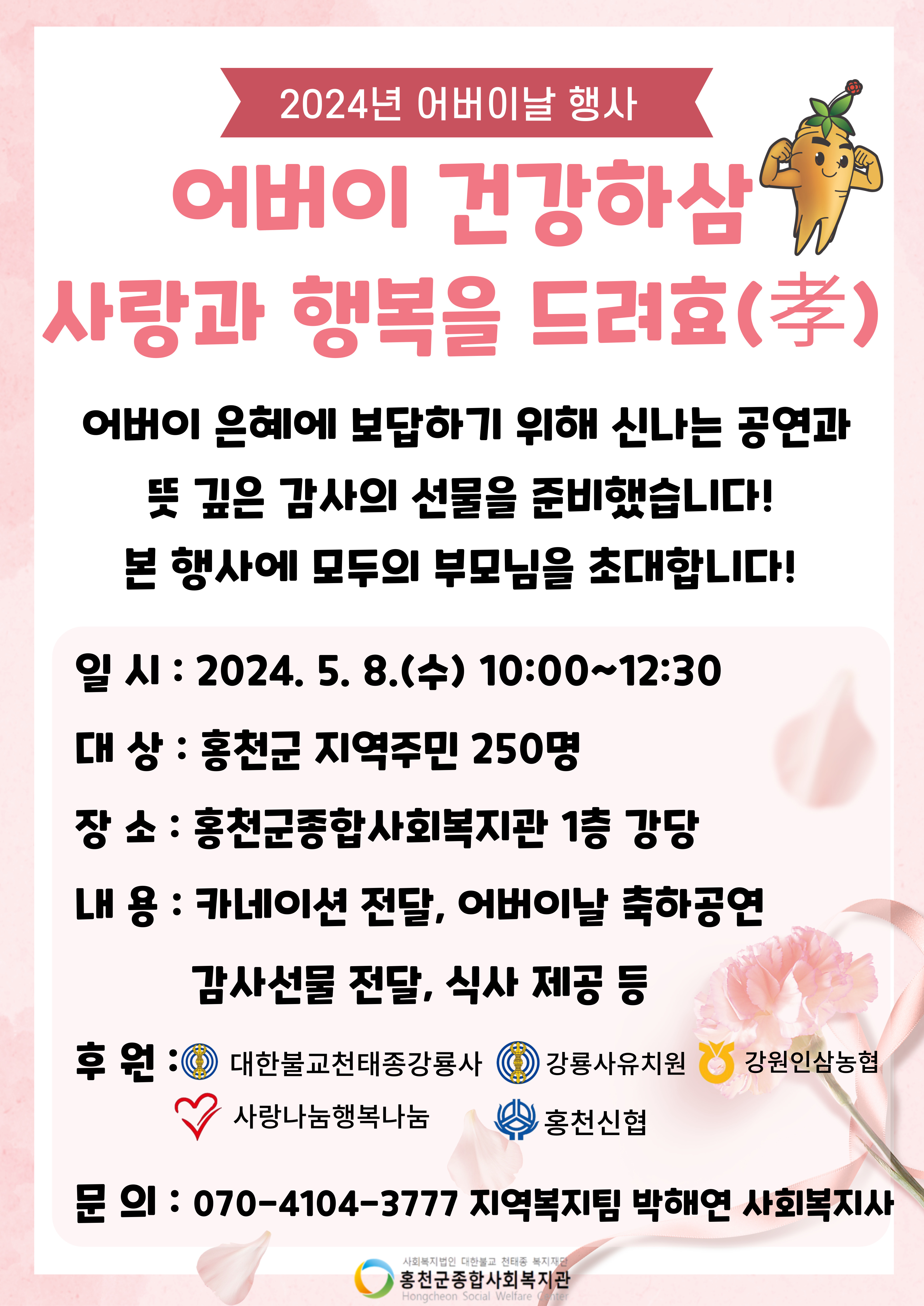 홍천군종합사회복지관(관장:김시재)은 5월 8일 수요일 오전 10시 홍천군종합사회복지관 1층 강당에서 어버이날을 맞이하여 지역주민 간 전통풍습을 함께 나눌 수 있는 “어버이 건강하삼, 사랑과 행복을 드려효(孝)”행사를 진행한다. 이번 어버이날 행사는 지역주민 250명을 대상으로 노래 공연과 인삼 묘삼 화분, 카네이션...