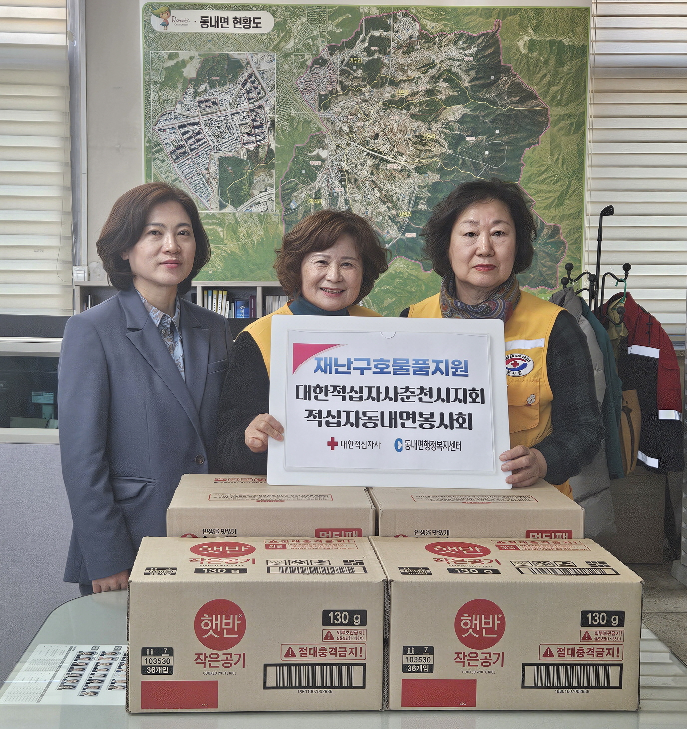 적십자동내면봉사회(회장 권점순)는 2월 19일 춘천시 동내면행정복지센터(면장 최명애)를 방문해 화재 피해 가정을 위한 구호 물품을 전달했다. 즉석식품과 라면으로 구성된 구호물품은 최근 발생한 관내 아파트 화재로 어려움에 처한 가구들에 배부될 예정이다. 적십자동내면봉사회는 지난 2월 10일에도 생필품, 식료품, 이...