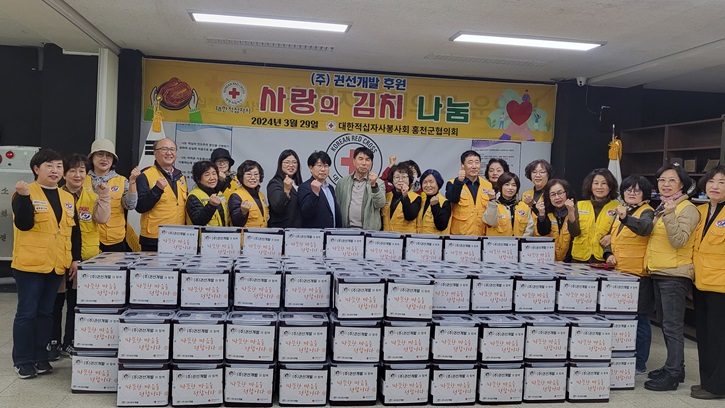 대한적십자사봉사회 홍천군협의회(회장 이경숙)는 지난 3월 29일 대한적십자사봉사회 홍천군협의회 사무실(홍천읍 태학여내길 22)에서 사랑의 김치 나눔 행사를 개최했다. 이번 행사는 취약계층 이웃들의 건강한 한끼 식사를 위해 마련됐으며, 권선개발(대표 이종심)의 후원과 함께 홍천군협의회 소속 봉사원 20여 명이 참여...