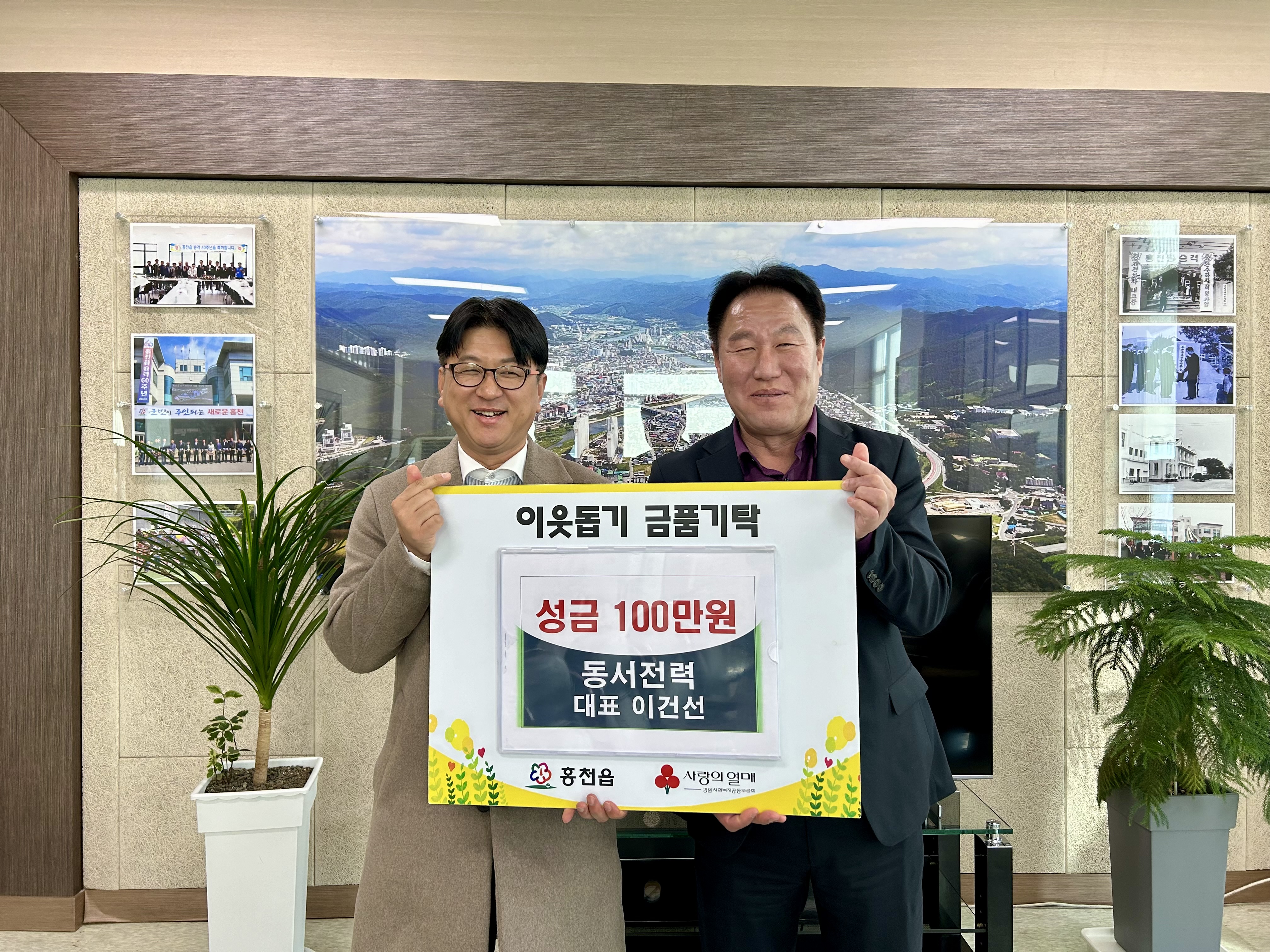 (주)동서전력(대표 이건선)은 지난 3월 13일 홍천읍행정복지센터를 방문해 이웃돕기 성금 100만원을 기탁했다.