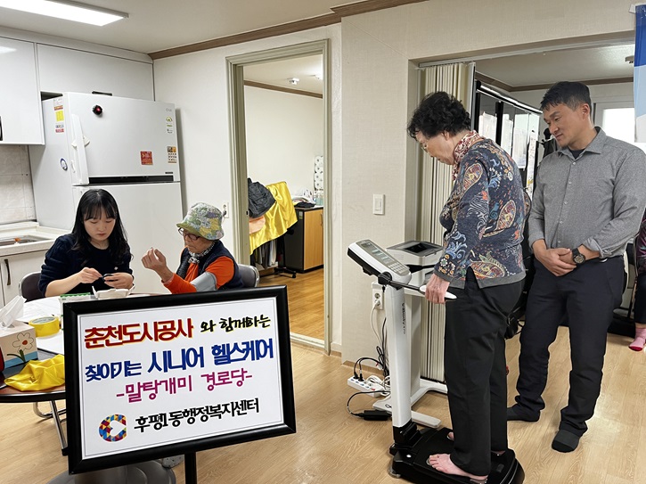춘천시 후평1동 행정복지센터는 지난 3월 14일 춘천도시공사(사장 홍영)와 함께 말탕개미 경로당을 방문해 어르신들을 대상으로 기초 검사, 건강 체조 등을 진행했다.