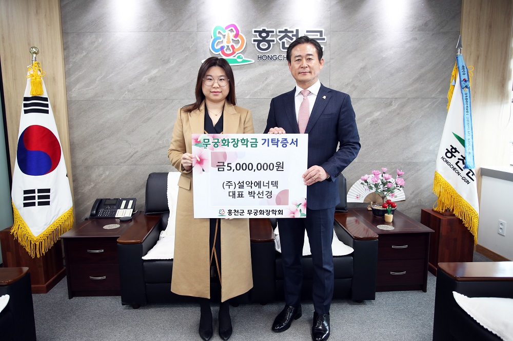 (주)설악에너텍(대표 박선경)은 지난 2월 22일 오전 10시 홍천군청을 방문하여 홍천군 인재육성을 위한 무궁화장학금을 500만원 기탁했다.