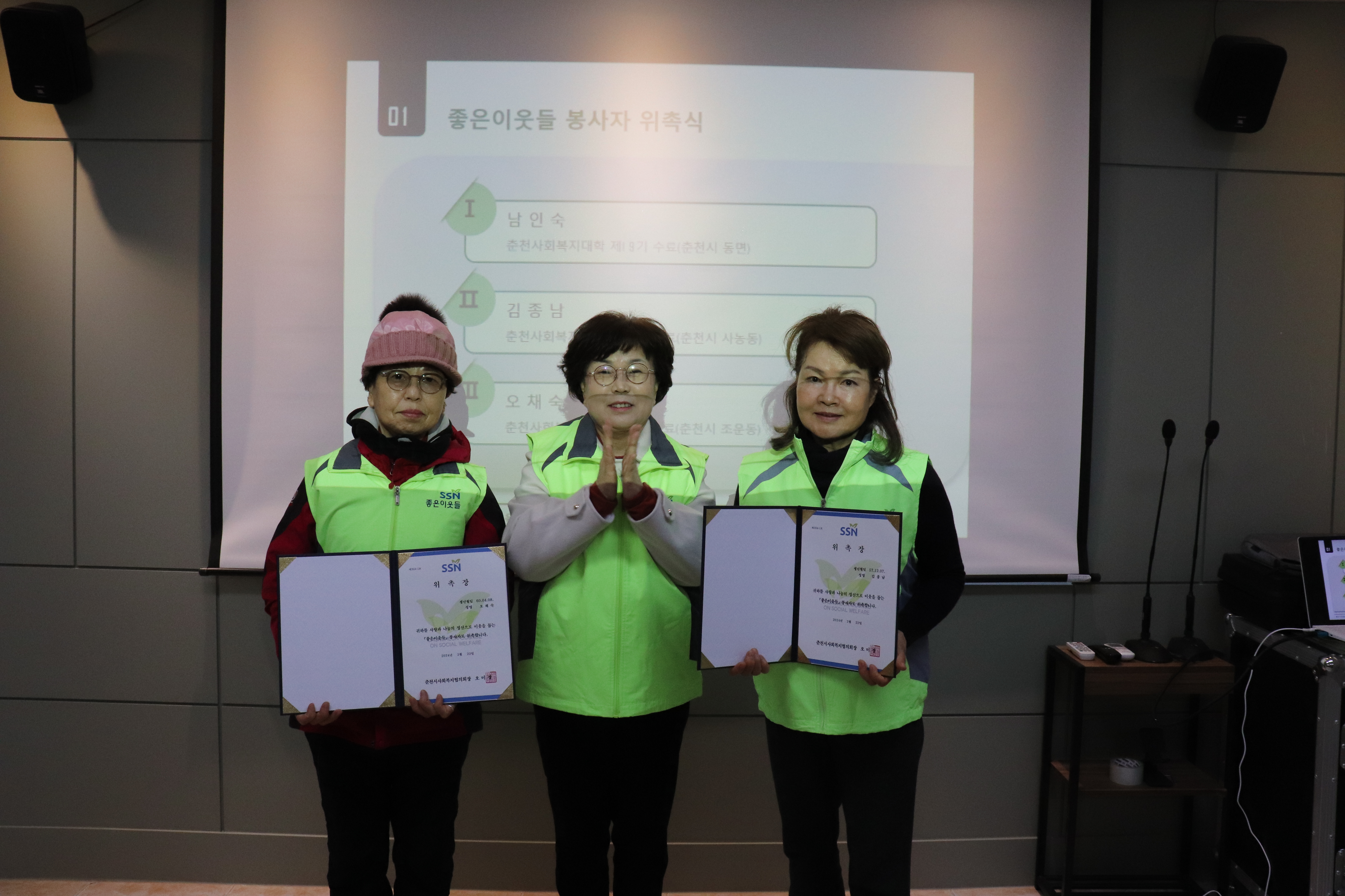 춘천시사회복지협의회(회장 오미경)는 지난 2월 22일 춘천시사회복지협의회 강의실에서 복지소외계층 발굴 및 민간자원 연계·지원 사업인 “좋은이웃들사업”의 위촉식 및 간담회를 진행하였다. 신규 봉사자 2명에 대한 위촉식을 통해 복지사각지대 발굴에 대한 책임감과 춘천시사회복지협의회 봉사단에 대한 소속감을 증진...